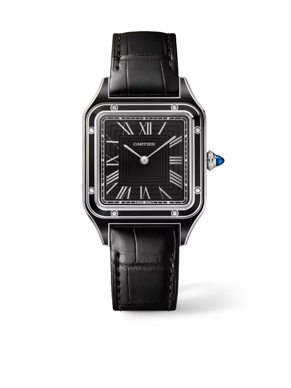 Santos-Dumont, großes Modell, mechanisches Manufaktur-Uhrwerk mit Handaufzug, Kaliber 430 MC. Gehäuse aus Stahl mit schwarzem Lack, perlierte Krone aus Stahl, besetzt mit einem synthetischen blauen Spinellcabochon, schwarzes Zifferblatt, eckiger Dekor mit durchscheinendem Lack, römische Ziffern, schwertförmige Zeiger aus Stahl, Saphirglas. Gehäuseboden mit gravierter Signatur von Alberto Santos-Dumont. Armband aus Alligatorleder in Schwarz, Stiftschließe aus Stahl. Gehäuseabmessungen: 43,5 mm x 31,4 mm. Höhe: 7,3 mm. Wasserdicht bis zu 3 bar.