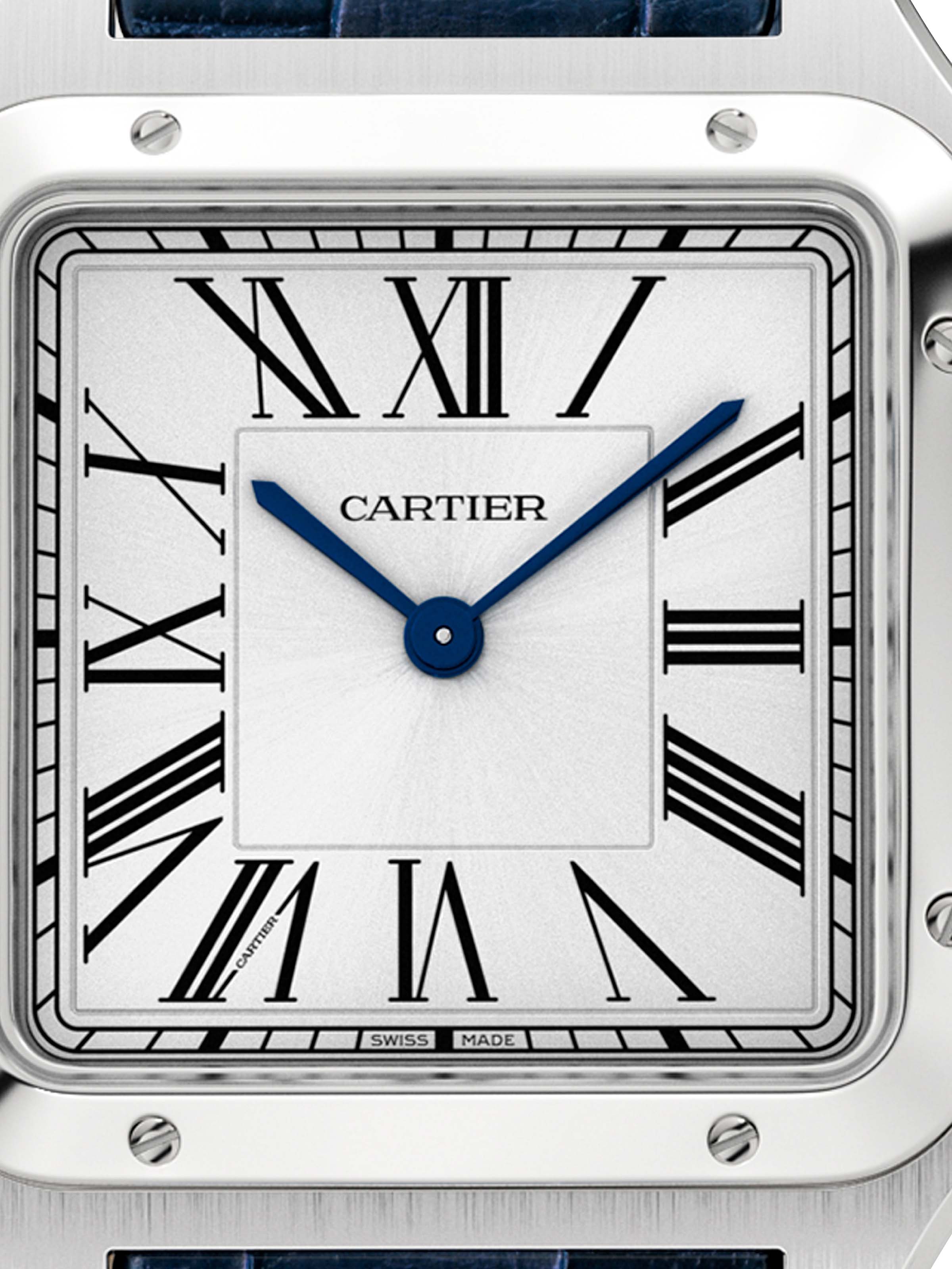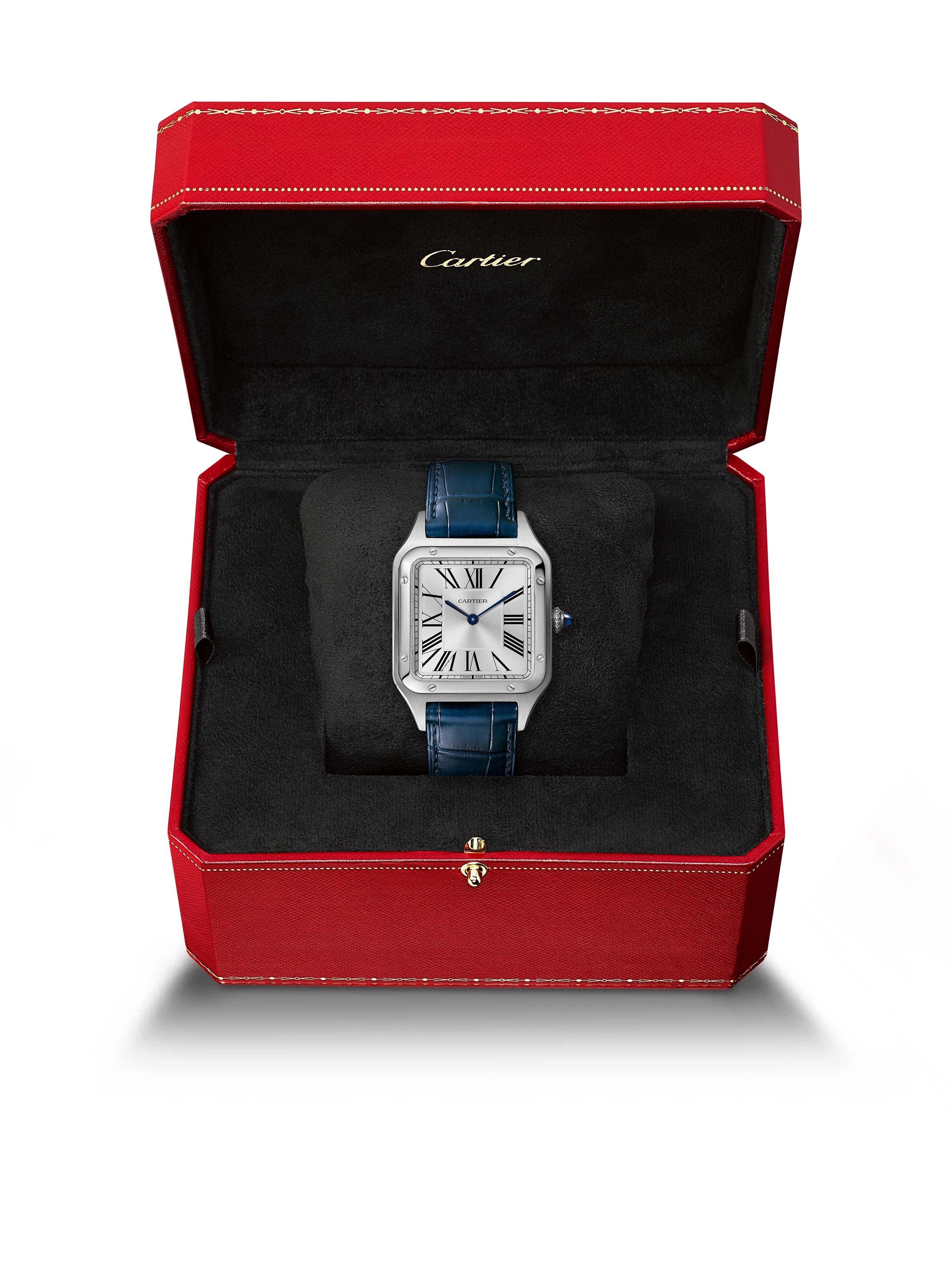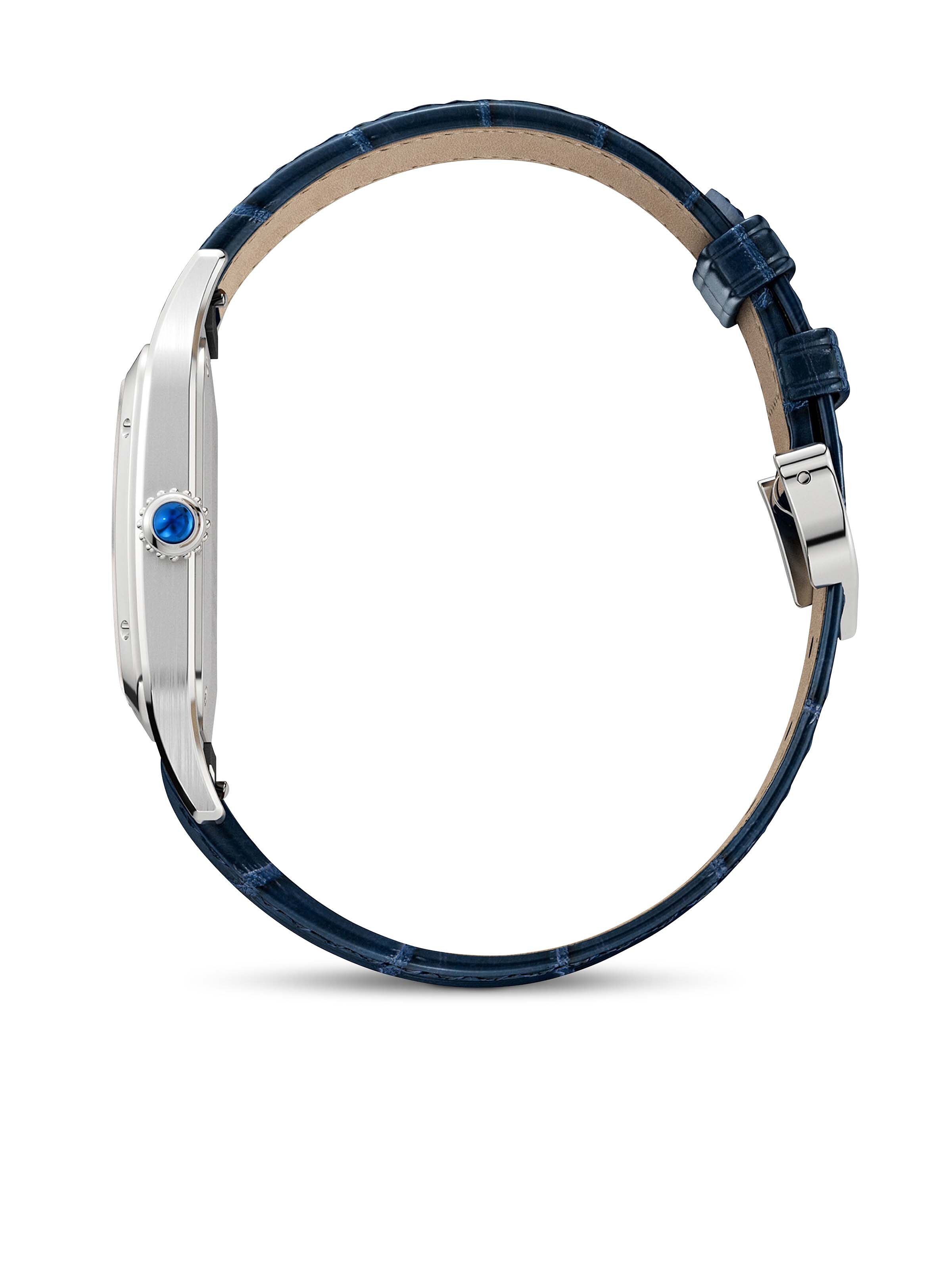 Santos-Dumont, großes Modell, Quarzwerk mit langer Laufzeit (~ 6 Jahre). Gehäuse aus Stahl, perlierte Krone mit einem synthetischen blauen Spinellcabochon besetzt, satiniertes silberfarbenes Zifferblatt mit Sonnenschliff, römische Ziffern, schwertförmige Zeiger aus gebläutem Stahl, Saphirglas, Armband aus marineblauem Alligatorleder, Stiftschließe aus Stahl. Gehäuseabmessungen: 43,5 x 31,4 mm. Höhe: 7,3 mm. Wasserdicht bis zu 3 bar.
