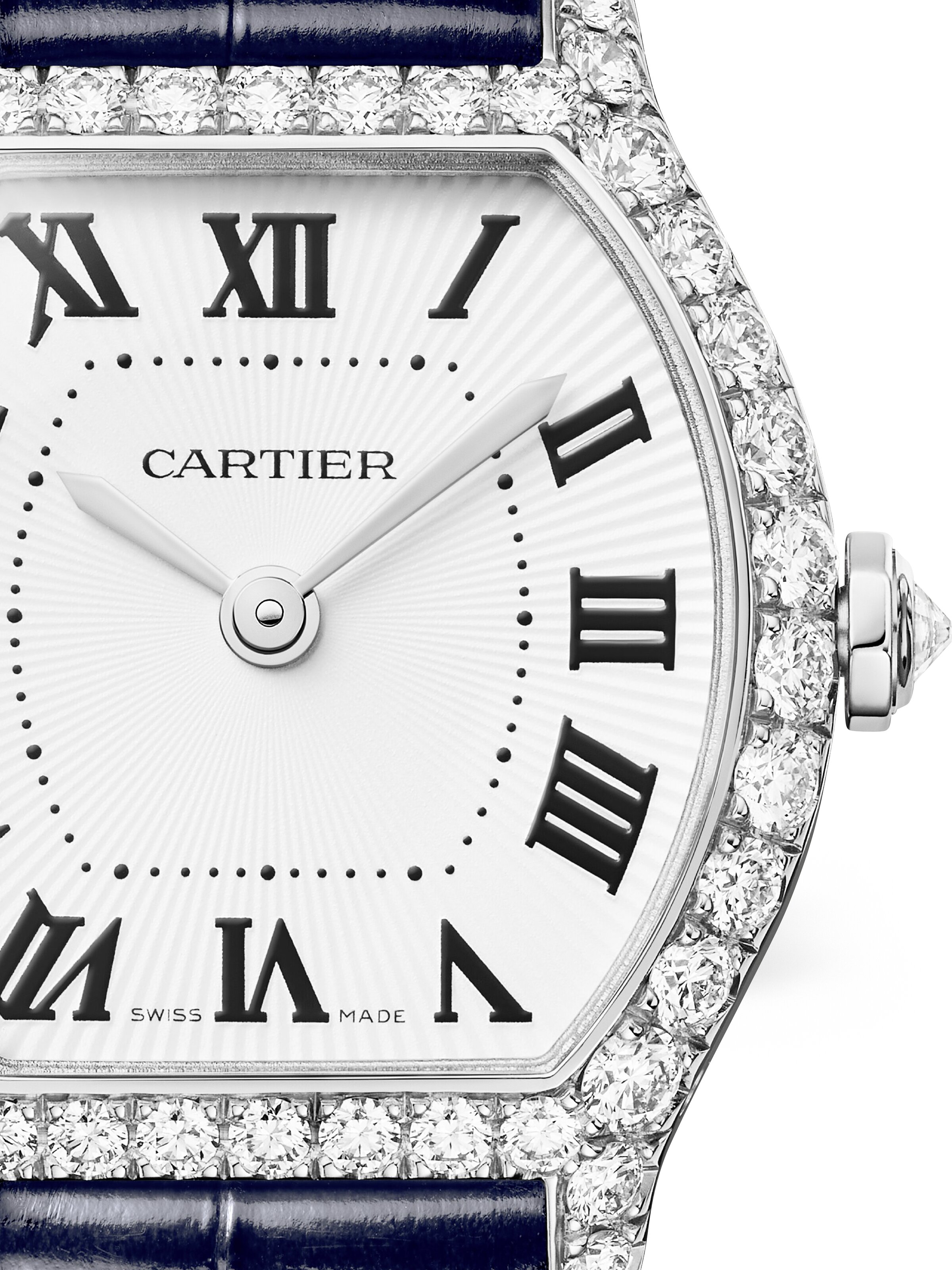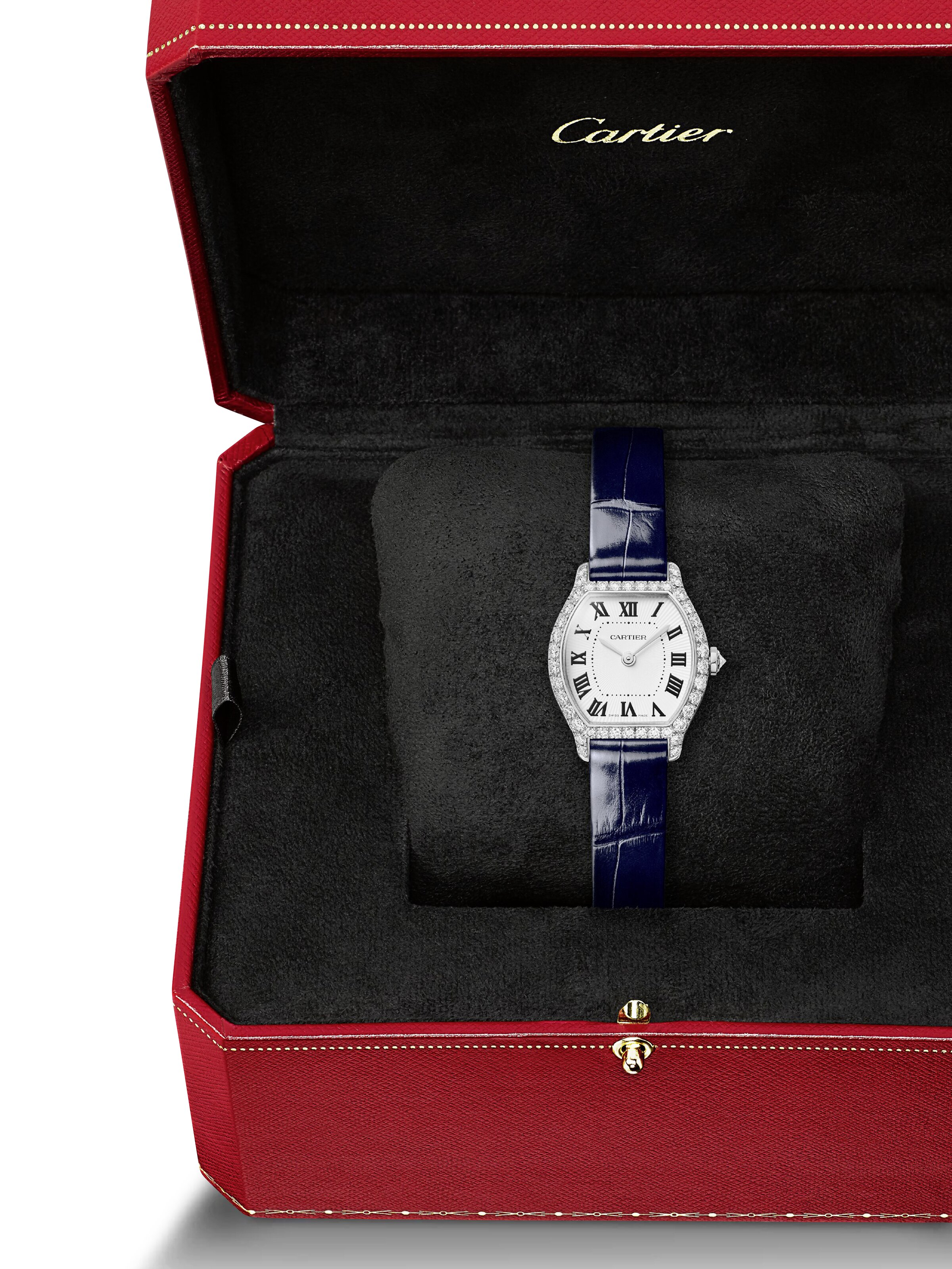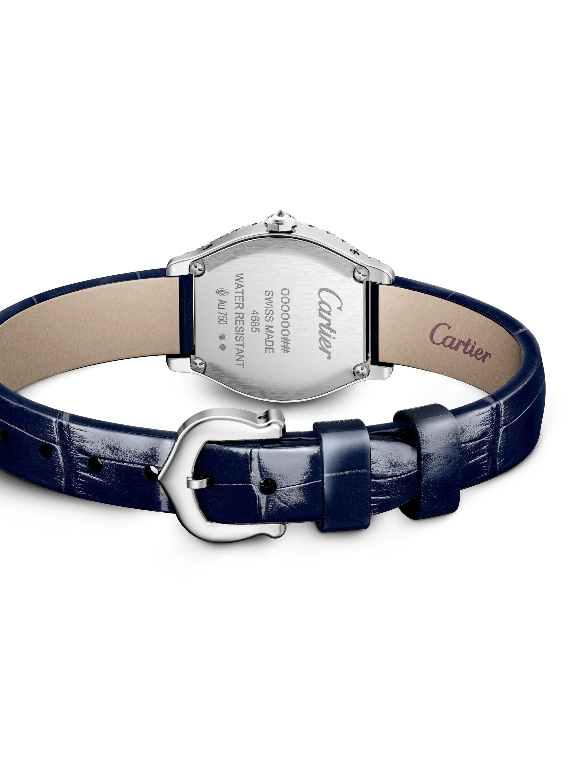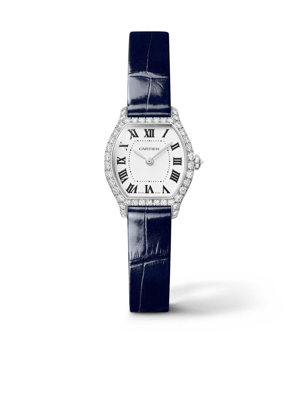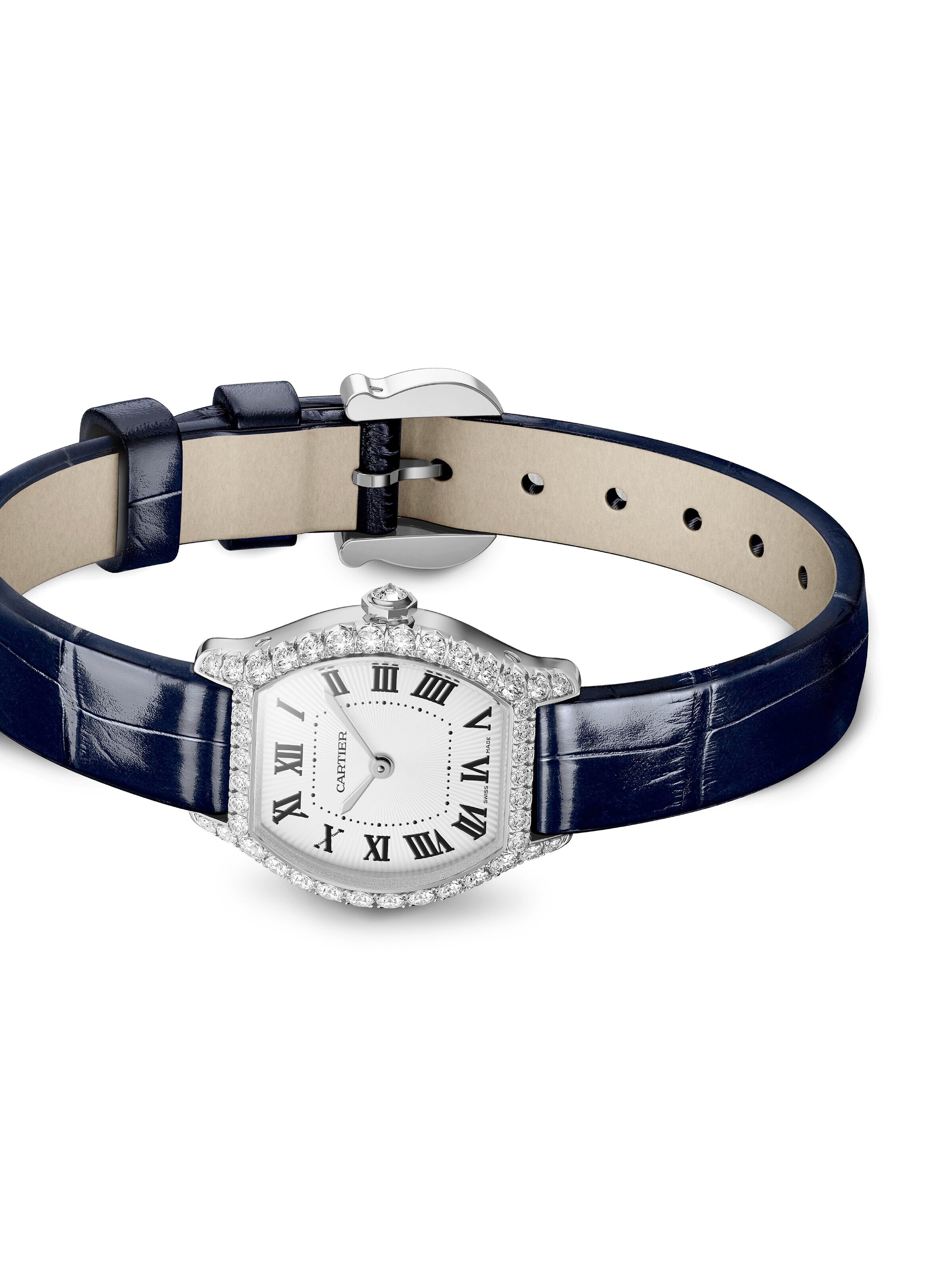 Cartier Tortue Mini 26,1 x 20,9 mm, 18k Weißgold mit blauem Alligatorlederarmband, Quarz-Kaliber | Referenz-Nr. CA230040