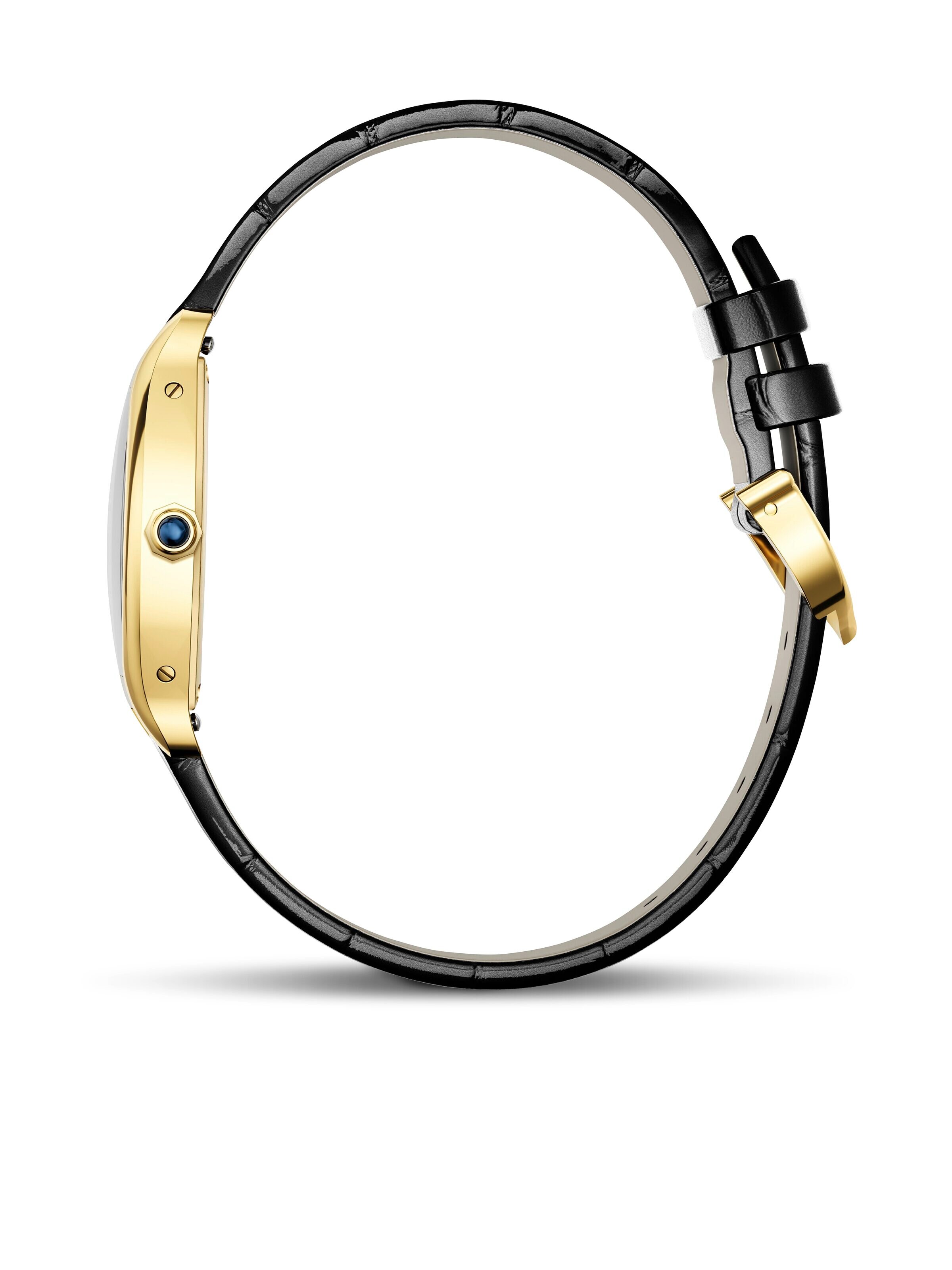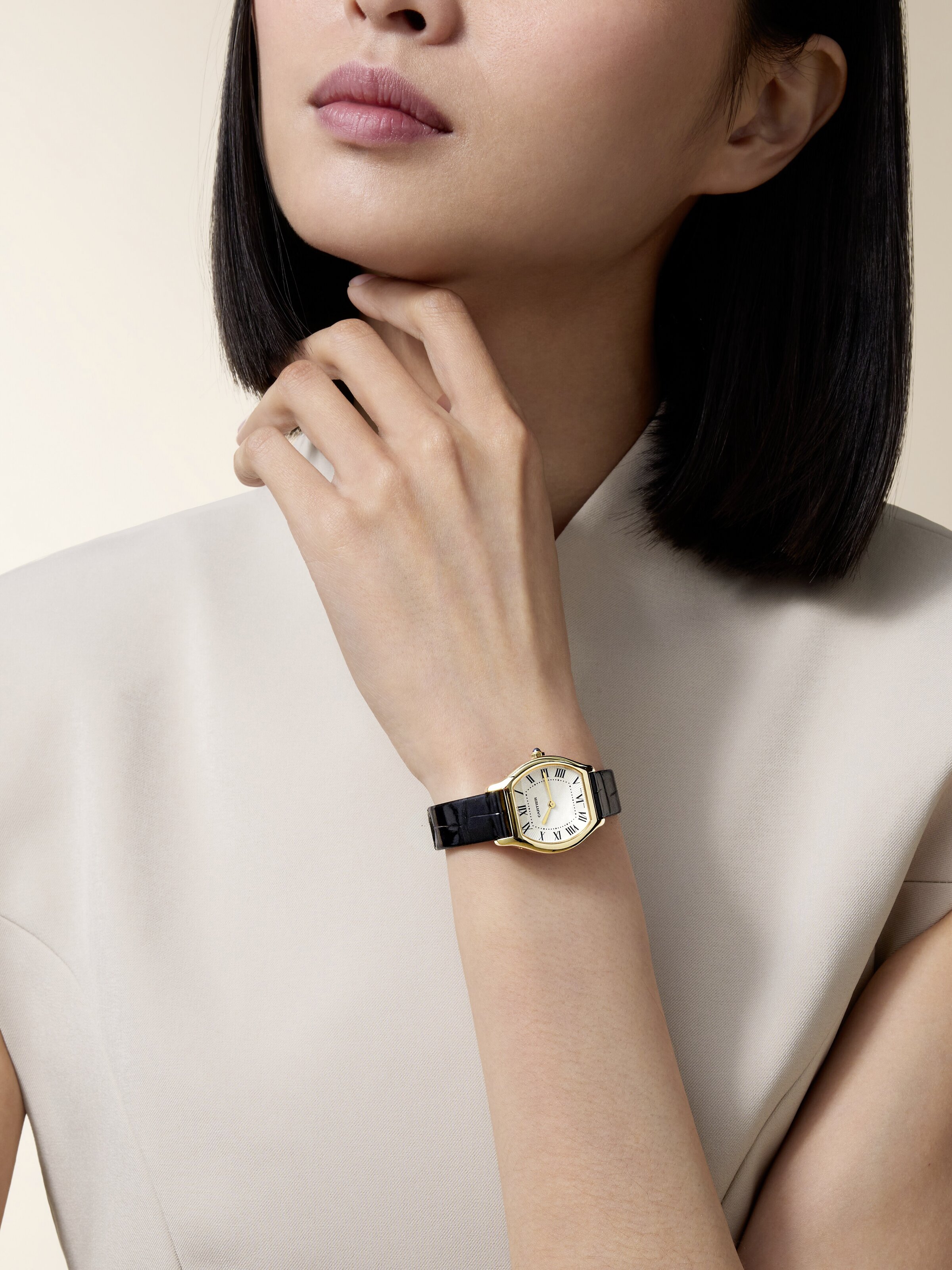 Diese goldene Armbanduhr von Cartier (Ref. WGTO0015) vereint luxuriöse Raffinesse mit zeitloser Klarheit. Das warme 18k Gelbgold des Gehäuses und der Lünette setzt einen edlen Akzent, der sich harmonisch mit dem champagnerfarbenen Zifferblatt verbindet. Römische Ziffern und schlanke Zeiger sorgen für eine klassische Anmutung, welche die Eleganz des Designs unterstreicht und die Zeit auf einen Blick erfassbar macht. Ein schwarzes Armband aus Alligatorleder ergänzt die feine Ausstrahlung mit einer dezenten, zugleich markanten Note und vermittelt ein angenehmes Tragegefühl am Handgelenk. Im Inneren arbeitet ein präzises Quarzwerk, das zuverlässige Zeitmessung im Alltag ermöglicht. Das widerstandsfähige Saphirglas schützt das Zifferblatt und betont den hohen Anspruch an Qualität. Mit einer Wasserdichtigkeit von bis zu 3 bar eignet sich dieser Zeitmesser auch für den urbanen Alltag, in dem Stilbewusstsein und funktionale Zuverlässigkeit gleichermaßen geschätzt werden.