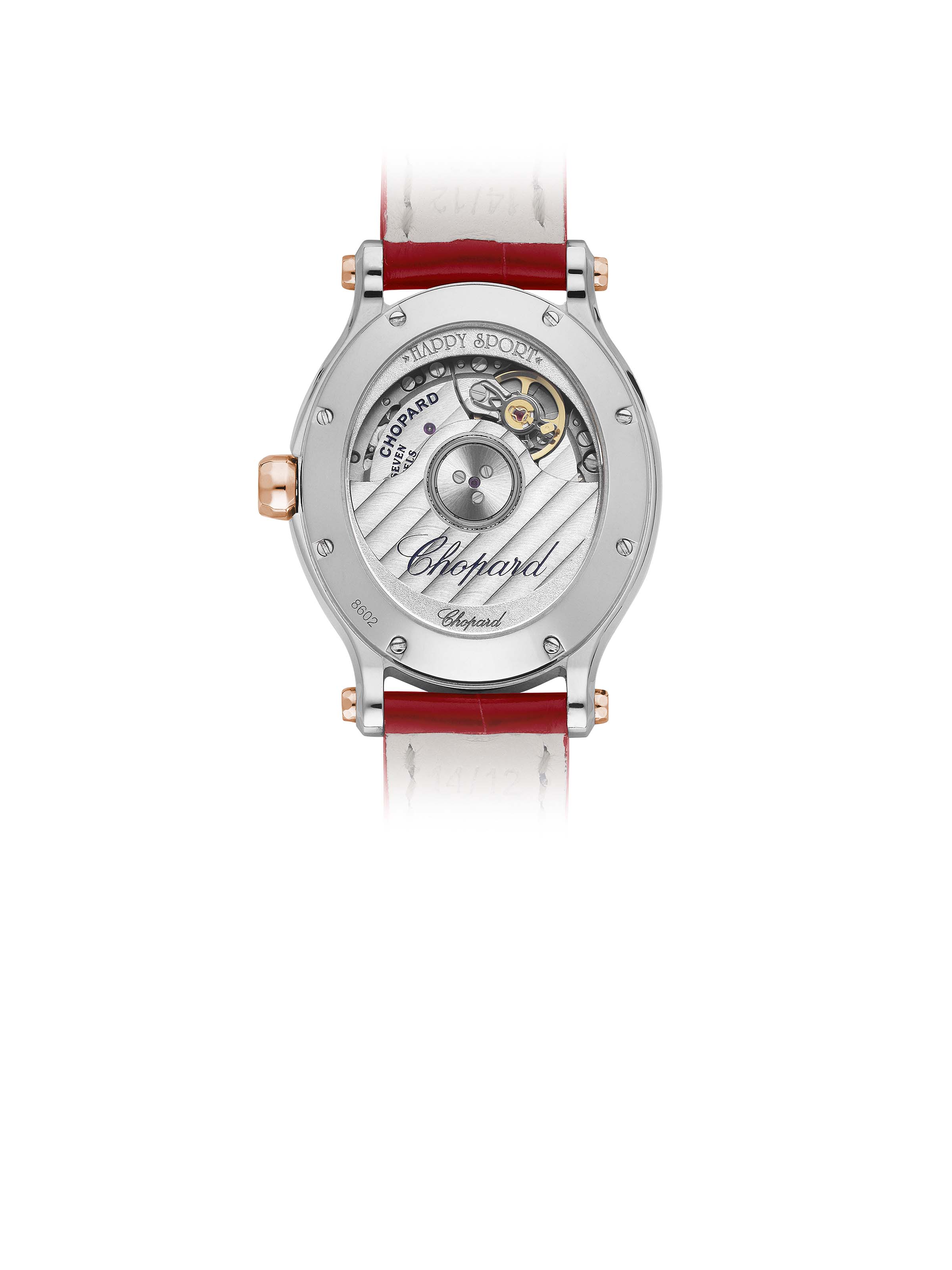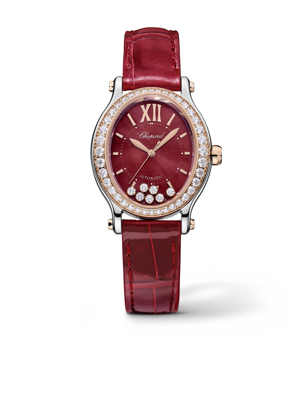 Happy Sport Oval Automatic 29 mm x 31,31 mm, 18k Roségold und Edelstahl mit rotem Alligatorlederarmband, Automatik-Manufakturkaliber 09.01-C | Referenz-Nr. CH410069