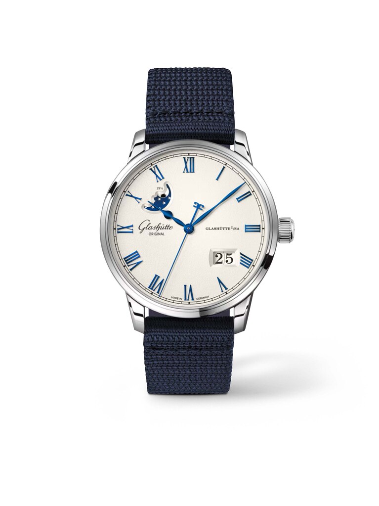 Senator Excellence Panoramadatum Mondphase 40 mm, Edelstahl mit blauem Synthetikarmband, Automatik-Manufakturkaliber 36-24 mit Panoramadatum und Mondphasenanzeige | Referenz-Nr. GL020133