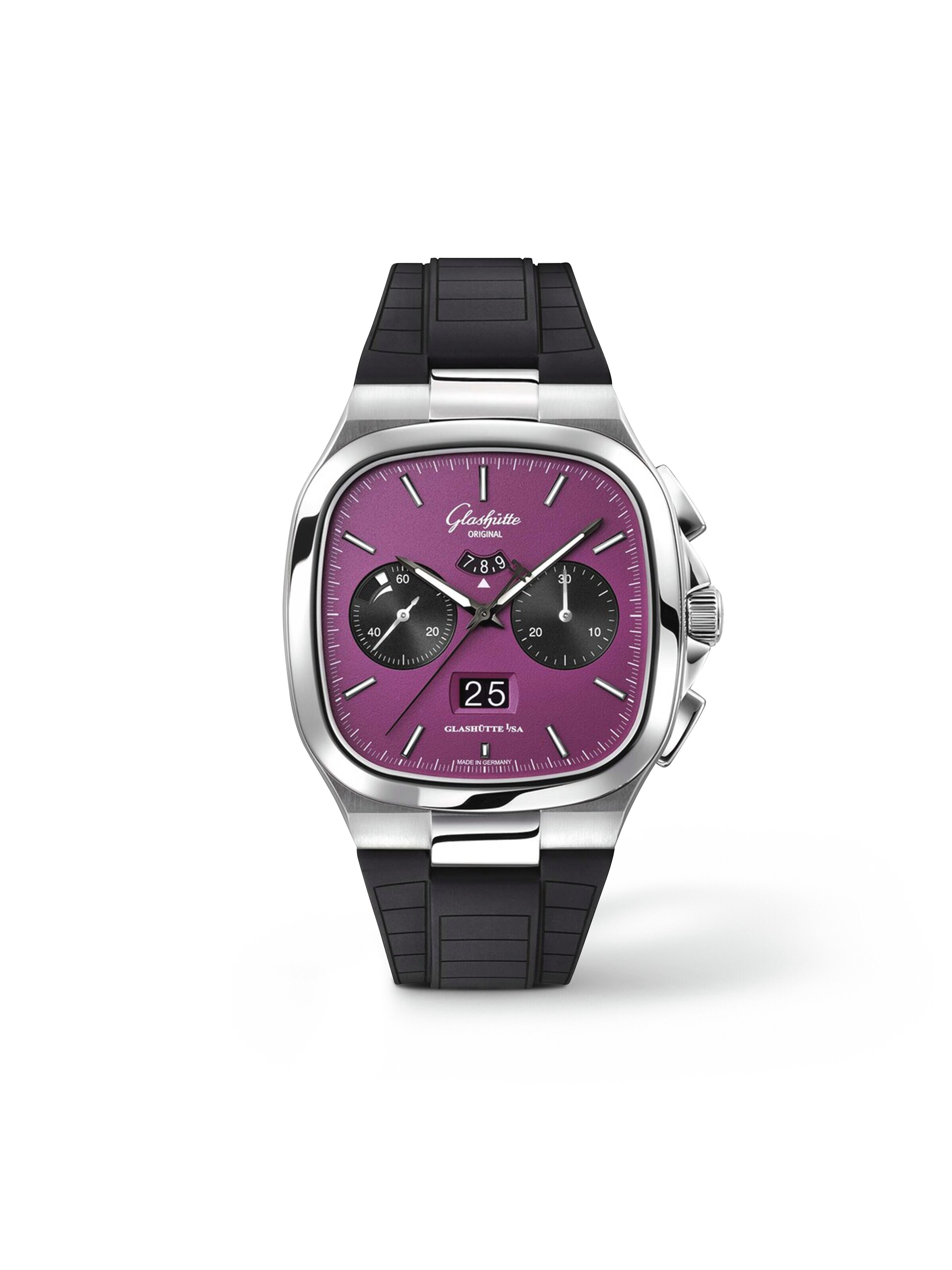 Die Glashütte Original Vintage Seventies Ref. 1-37-02-20-02-63 ist eine Hommage an eine Ära, die für ihren Mut zur Farbe und Form bekannt war. Mit nur 100 Exemplaren weltweit verkörpert diese limitierte Edition Exklusivität und Handwerkskunst. Das violette Zifferblatt fängt den Geist der Siebziger ein und setzt ein kühnes Statement am Handgelenk eines jeden Herrn. Das Manufakturkaliber 37-02, welches in dieser Uhr tickt, ist ein Meisterwerk der Uhrmacherkunst, das mit Funktionen wie Chronograph, Großdatum, Anzeige der Gangreserve und Flyback überzeugt. Eine Gangreserve von beeindruckenden 70 Stunden unterstreicht die technische Raffinesse dieses Zeitmessers. Das robuste Edelstahlgehäuse, gepaart mit einem strapazierfähigen schwarzen Kautschukarmband und einer Wasserdichtigkeit von bis zu 10 bar, macht die Uhr zu einem zuverlässigen Begleiter für alle Lebenslagen. Abgerundet wird das Design durch ein kratzfestes Saphirglas und eine Faltschließe, welche den Tragekomfort und die Sicherheit erhöht.