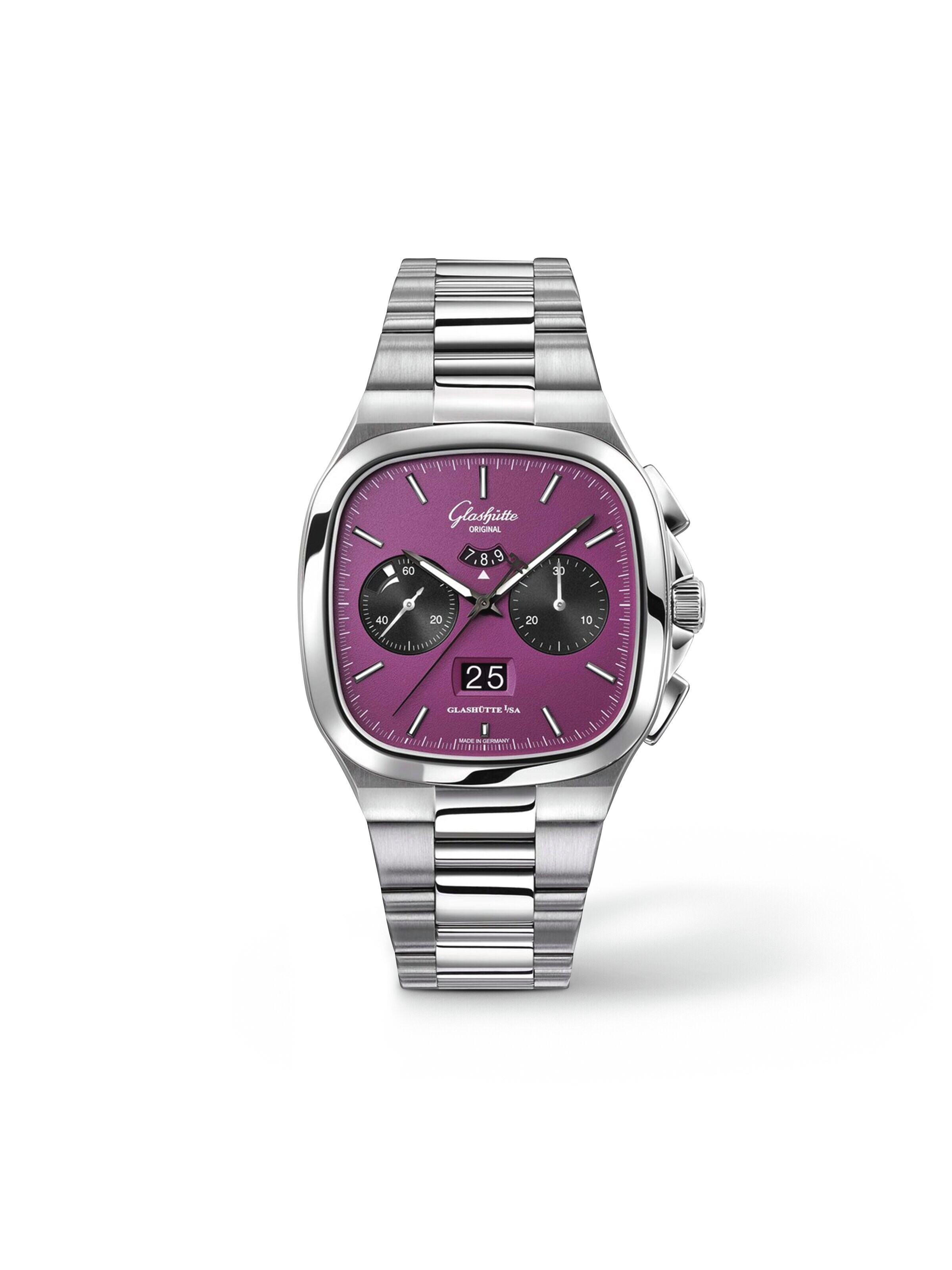 Die Glashütte Original Seventies Kollektion, limitiert auf nur 100 Exemplare, verkörpert die Quintessenz des Herrenstils mit einem Hauch von Vintage. Diese Uhr, Referenz 1-37-02-20-02-70, ist eine Hommage an das Design der 1970er Jahre, neu interpretiert für den modernen Mann. Ihr violett schimmerndes Zifferblatt setzt einen mutigen Akzent unter den Zeitmessern und wird von einem robusten Edelstahlgehäuse umschlossen. Das Herzstück bildet das Manufakturkaliber 37-02, welches eine Gangreserve von beeindruckenden 70 Stunden bietet. Zusätzlich zur Zeitmessung verfügt sie über eine Großdatumsanzeige, eine kleine Sekunde sowie über die Funktionen eines Chronographen mit Flyback-Mechanismus. Die Wasserdichtigkeit bis zu 10 bar und das kratzfeste Saphirglas machen sie zu einem zuverlässigen Instrument für jeden Tag. Abgerundet wird das Ganze durch ein Edelstahlarmband mit Faltschließe, welches nicht nur für einen sicheren Halt sorgt, sondern auch den zeitlosen Charakter dieser außergewöhnlichen Uhr unterstreicht.