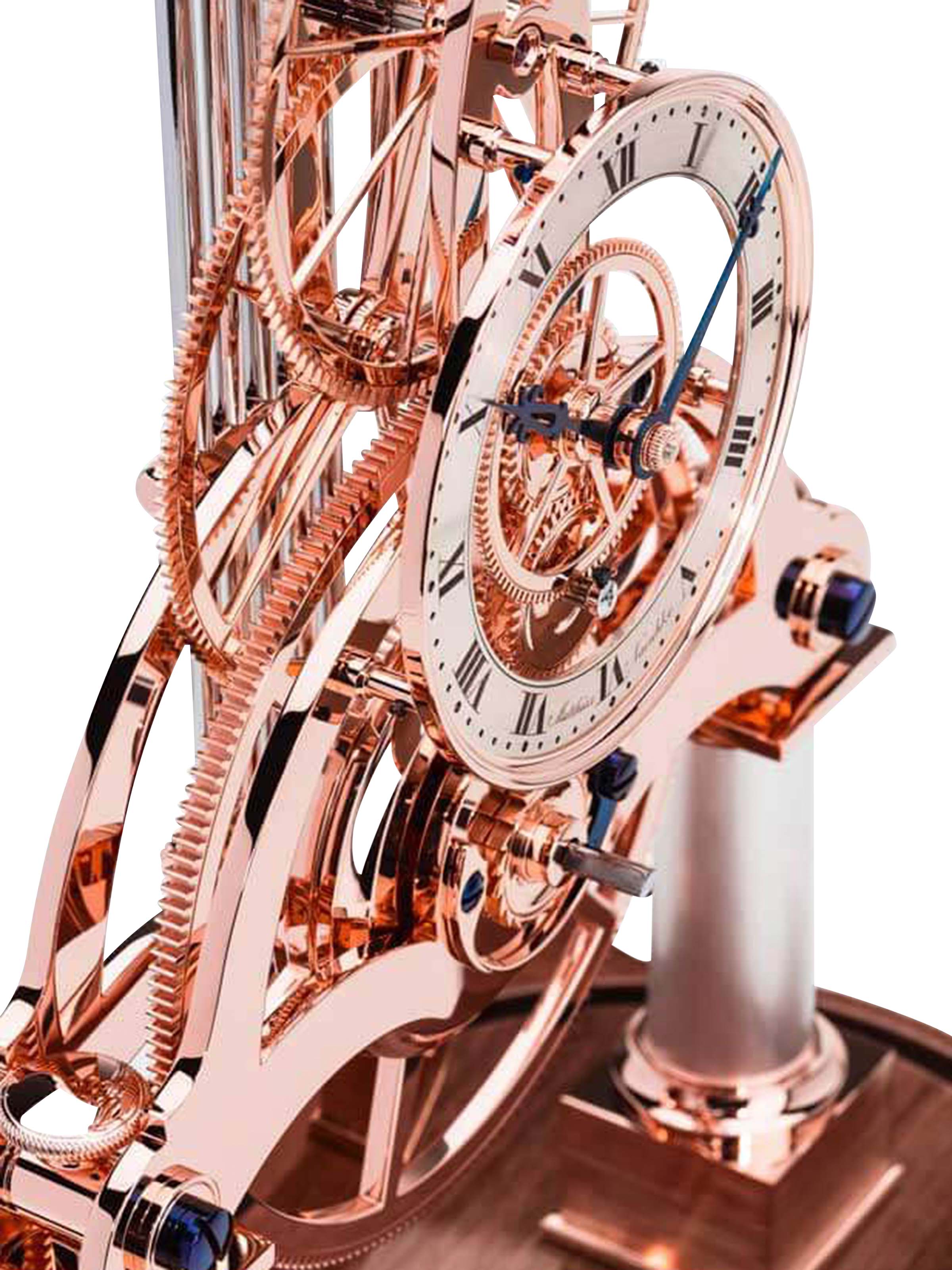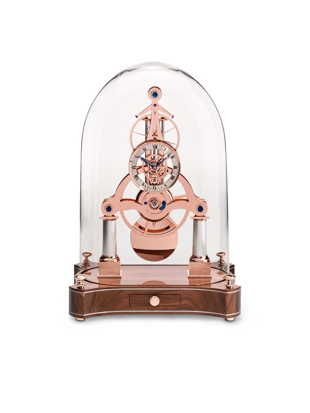 Die Tischuhren NT 8 aus dem Atelier Matthias Naeschke zeichnen sich durch technische und handwerkliche Finessen "Made in Haigerloch" aus. Im mundgeblasenen Glassturz mit den Maßen 450 x 320 x 250 Millimeter zeigt diese aus rosévergoldete Messing gefertigte Ausführung (Ref. NT8RG NUSSBAUM) eine der flachsten Skelettuhren in Form eines klassischen Wochenläufers. Über eine geniale dreiteilige Federhauskonstruktion schiebt das Matthias Naeschke Kaliber 8 die von Hand gesägten und gebläuten Zeiger über einen mit feinsten Handgravuren versehenen Ziffernring aus Sterlingsilber, während ein 5-Stab-Kompensationspendel sichtbar hinter dem Uhrwerk schwingt und in Halbsekundenschritten den Takt angibt. Getragen wird dieser filigrane wie edle Zeitmesser von einem Sockel aus Nussbaumholz mit Hochglanz-Klarlack und kleiner Schublade, die den Aufzugschlüssel immer griffbereit hält.