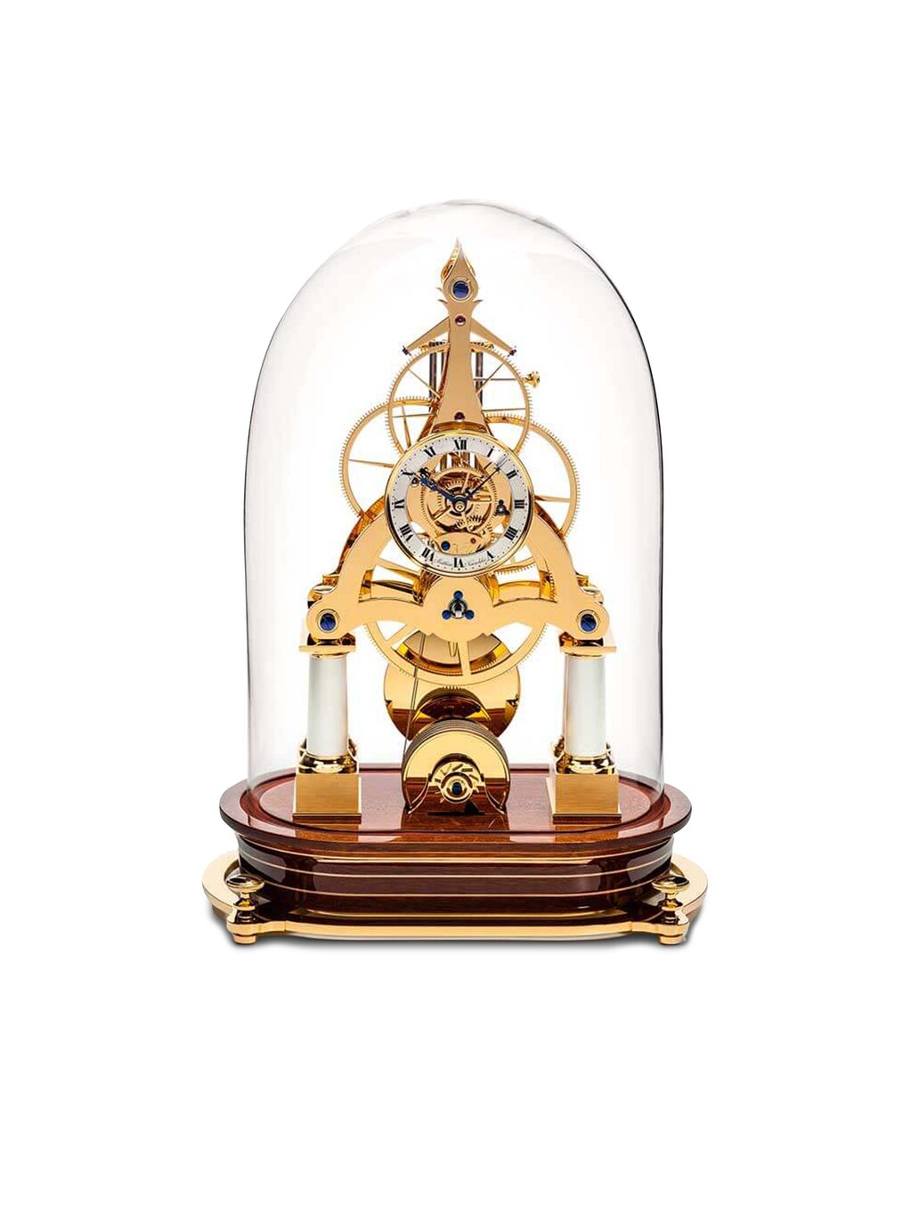 Die Tischuhr NT 10 aus dem Atelier Matthias Naeschke vereint meisterhafte Handwerkskunst mit technischer Präzision "Made in Haigerloch". Im Mineralglassturz mit den Maßen 320 x 500 x 250 Millimeter präsentiert diese aus vergoldetem Messing gefertigte Ausführung ein klassisches Pendelwerk, welches vom hauseigenen Manufakturkaliber angetrieben wird. Über die filigranen, von Hand gebläuten Stahlzeiger gleitet der auf einem silberfarbenen Zifferblatt mit römischen Ziffern angelegte Stundenring, während das Pendel im Takt des Uhrwerks schwingt. Getragen wird dieser elegante Zeitmesser von einem Sockel aus hochwertigem Holz, welcher die feinen mechanischen Details optimal zur Geltung bringt.