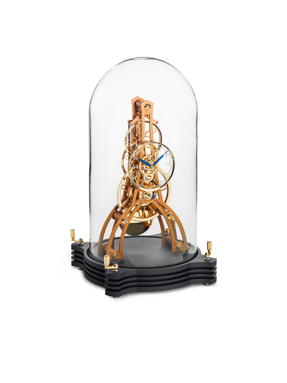 Die Tischuhren NT 8 GT von Matthias Naeschke kombinieren klassische Mechanik mit modernem Design, neuen Werkstoffen und verschiedensten Farben. Dieser klassische Wochenläufer (Ref. NT 8 GT ALU. BRONZE ELOXIERT) wurde im Naeschke-Atelier in Haigerloch aus Messing mit bronzefrabendem exolierten Aluminium handgefertigt und besticht durch seine filigrane, skelettierte Darstellung. Besondere Aufmerksamkeit verdient dabei nicht nur das sportlich anmutende Räderwerk, sondern auch der unkonventionelle Reif, der die Zeit statt mit Ziffern und einer Minuterie geometrisch erfasst. Angetrieben wird dieser Zeitmesser durch das Matthias Naeschke Kaliber 8 GT mit einer Laufdauer von 7 Tagen. Ein mundgeblasener Glassturz mit den Maßen 500 x 280 x 280 Millimeter und ein Sockel aus massivem Aluminium setzen dieses Meisterwerk der feinen Uhrmacherkunst in Szene.
