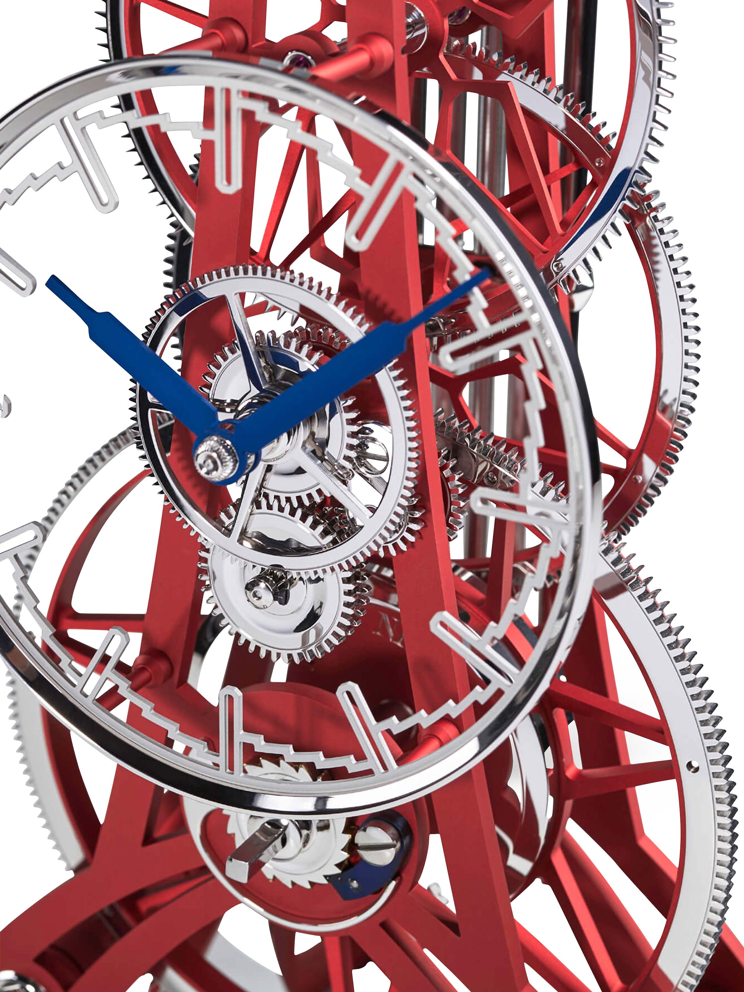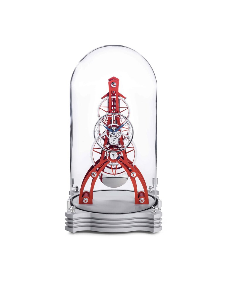 Die Tischuhr NT 8 GT aus dem Atelier Matthias Naeschke verbindet klare Linien mit feinster Uhrmacherkunst "Made in Haigerloch". Im Mineralglassturz mit den Maßen 280 x 500 x 280 Millimeter zeigt diese aus eloxiertem Aluminium gefertigte Ausführung ein skelettiertes Zifferblatt mit Indexziffern, welches vom Manufakturkaliber angetrieben wird. Die von Hand gebläuten Stahlzeiger ziehen präzise ihre Bahnen, während das Pendel den Takt des Uhrwerks vorgibt. Getragen wird dieser moderne Zeitmesser von einem puristischen Sockel, welcher die technische Raffinesse und Leichtigkeit der Uhr wirkungsvoll zur Geltung bringt.