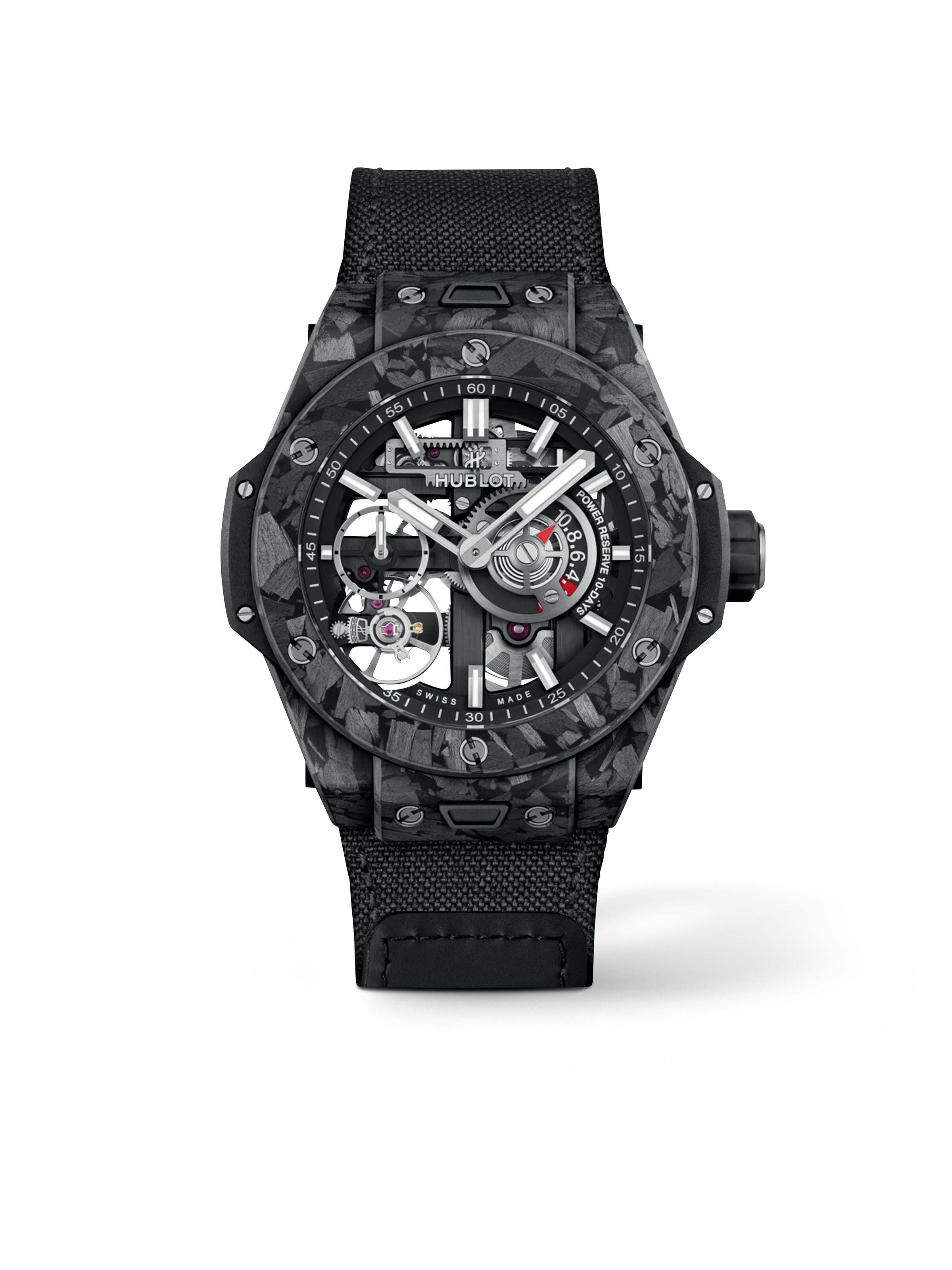 Big Bang Meca-10 Frosted Carbon 42 mm, Carbon mit schwarzem Textilarmband, Handaufzug-Manufakturkaliber HUB1205 mit Gangreserven-Anzeige | Referenz-Nr. HB050315