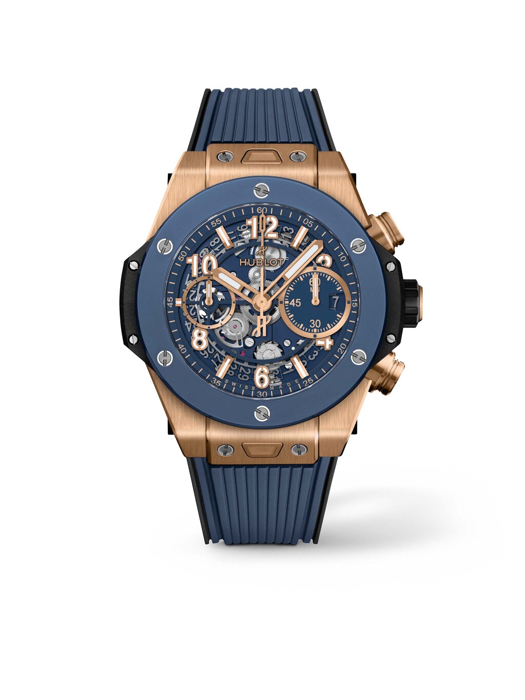 Die Big Bang Unico von Hublot ist eine Uhr, die nicht nur die Zeit misst, sondern auch den Puls der Moderne. Mit einem Durchmesser von 42 Millimetern und einem Gehäuse aus King Gold, welches für seine unvergleichliche Wärme und Eleganz steht, verkörpert sie eine neue Dimension des Luxus. Das skelettierte Zifferblatt gewährt Einblicke in das Herz des Zeitmessers, das HUB1280 Kaliber, ein Manufakturkaliber, welches mit einer beeindruckenden Gangreserve von 72 Stunden aufwartet. Die Funktionen Chronograph und Flyback unterstreichen die technische Raffinesse, während die Wasserdichtigkeit von 10 bar Abenteuer sowohl an Land als auch im Wasser verspricht. Ein Armband aus blauem Kautschuk fügt eine sportliche Note hinzu und sorgt für optimalen Tragekomfort. Abgerundet wird das Design durch eine Lünette aus King Gold und einen Boden aus Saphirglas, welche die Exklusivität dieses Meisterwerks unterstreichen. Die Big Bang Unico ist mehr als eine Uhr - sie ist ein Statement.