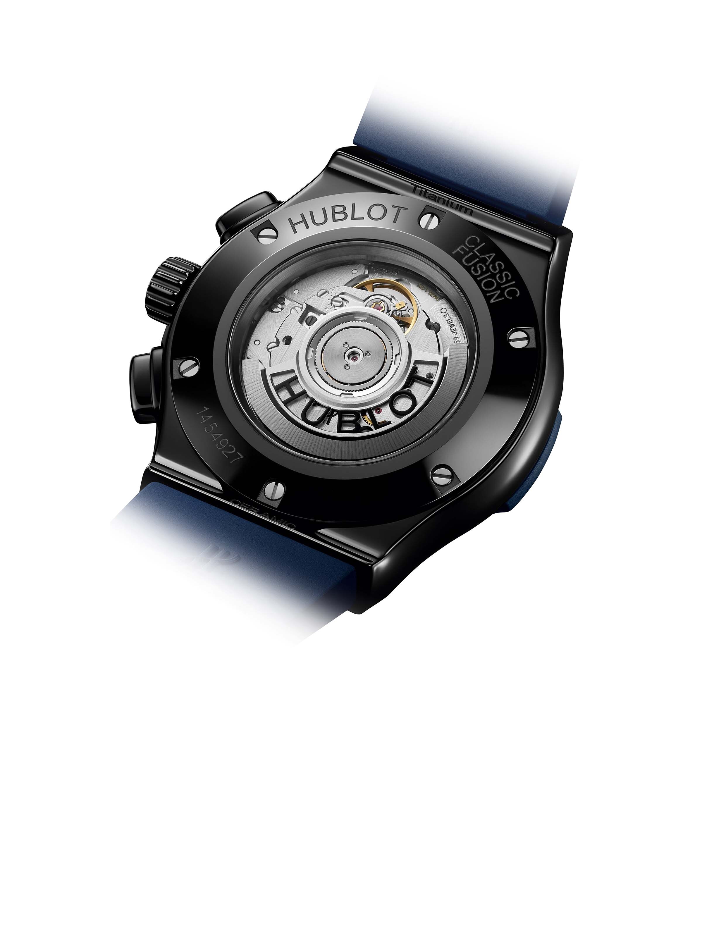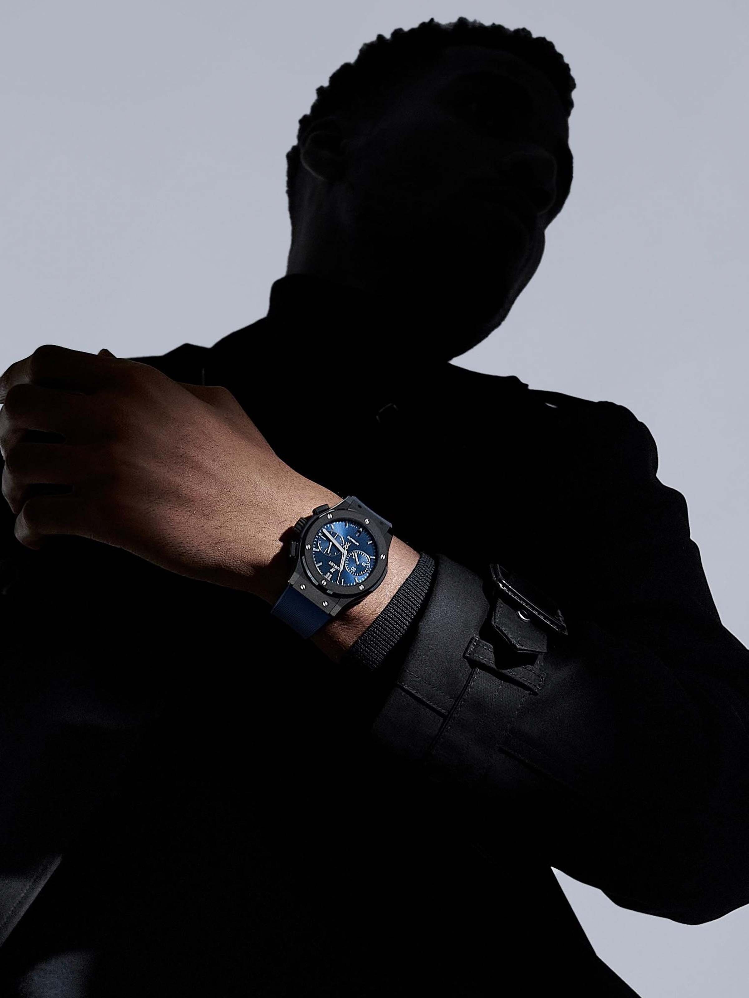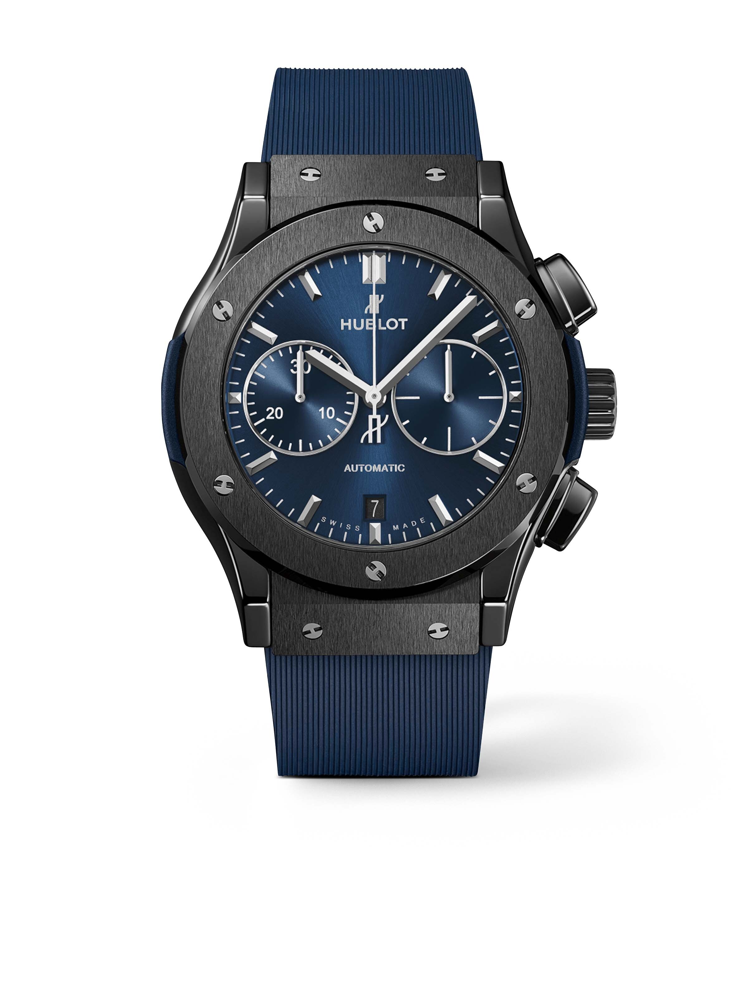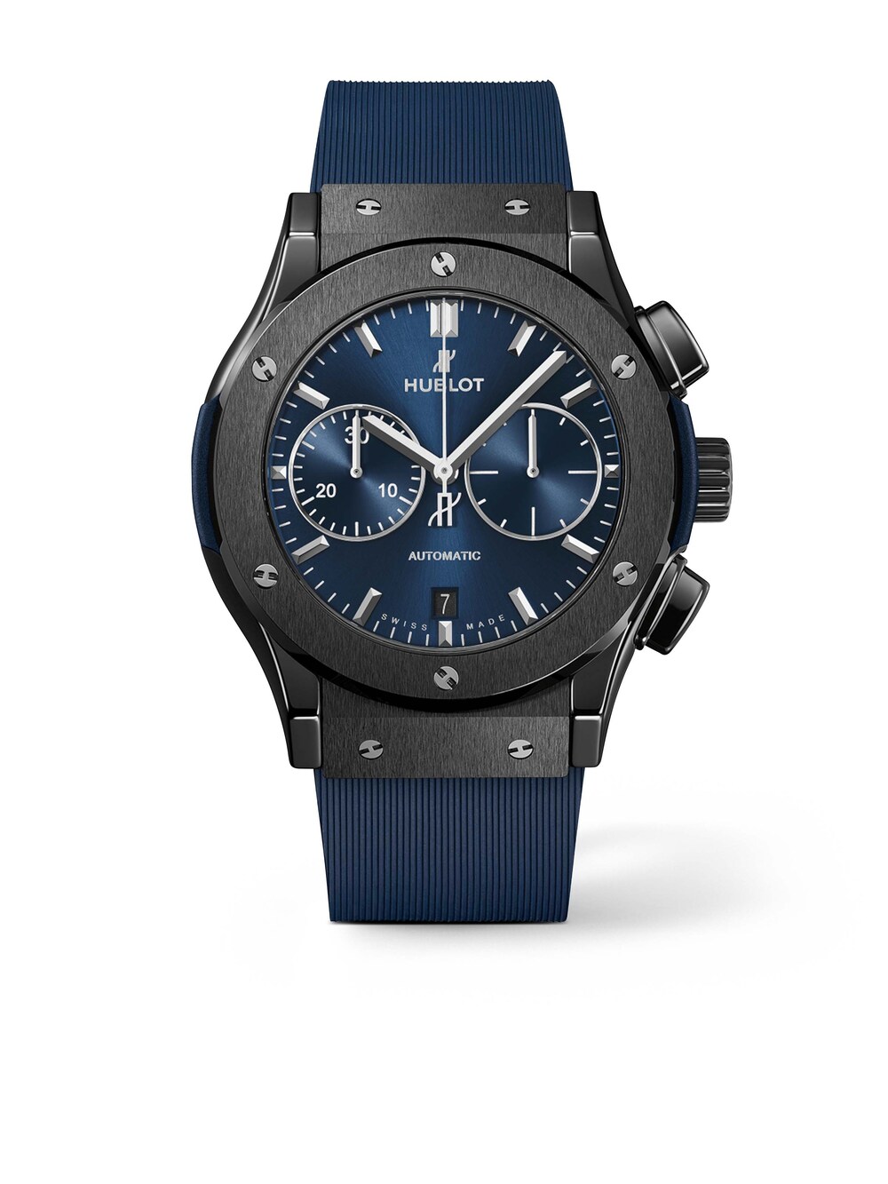 Classic Fusion Ceramic Blue Chronograph 45 mm, schwarze Keramik mit blauem Kautschukarmband, Automatik-Kaliber HUB1143 mit Chronographenfunktion und Datumsanzeige | Referenz-Nr. HB110291