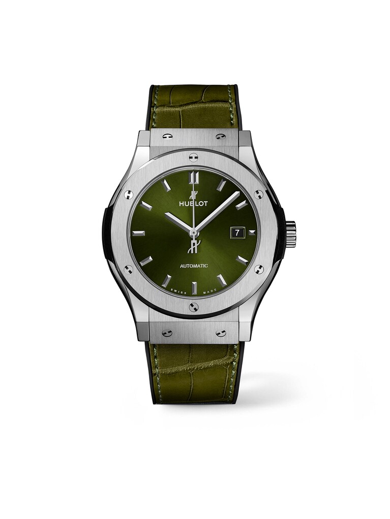 Classic Fusion Titanium Green 42 mm, Titan mit grünem Alligatorlederarmband, Automatik-Kaliber HUB1110 mit Datumsanzeige | Referenz-Nr. HB110143