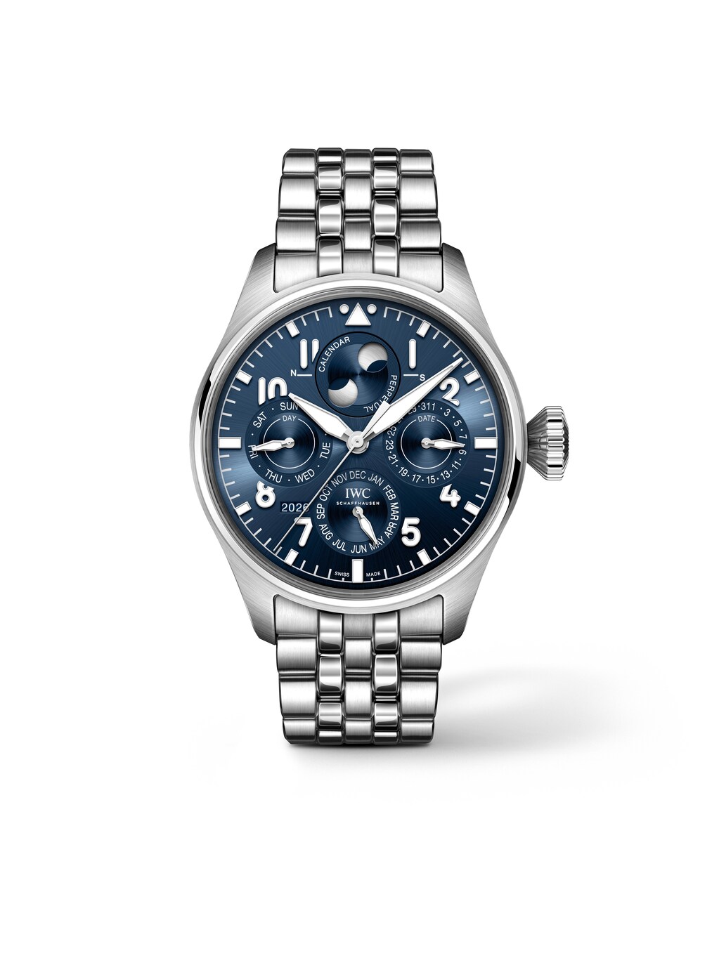 Die IWC Big Pilot Automatic (Ref. IW329601) interpretiert den markanten Instrumentencharakter in einem ausdrucksstarken Format von 42 Millimeter Durchmesser neu. Das blaue Zifferblatt mit arabischen Ziffern und Indizes sorgt gemeinsam mit der Zentralsekunde für eine klare, jederzeit präzise ablesbare Anzeige. Im Inneren arbeitet das automatische Manufakturkaliber 82665, welches eine Gangreserve von bis zu 60 Stunden bietet und durch seine konstruktive Souveränität überzeugt. Das Gehäuse aus Edelstahl, die passende Lünette und das integrierte Edelstahlarmband mit Faltschließe vermitteln ein wertiges Tragegefühl und einen sicheren Sitz am Handgelenk. Die Datumsfunktion mit Anzeige von Tag, Monat und Jahr erweitert den Nutzen im Alltag. Saphirglas ermöglicht den Blick auf Zifferblatt und Uhrwerk und unterstreicht zusammen mit der Wasserdichtigkeit bis 10 bar den hochwertigen Anspruch dieses Zeitmessers aus der Manufaktur von IWC.
