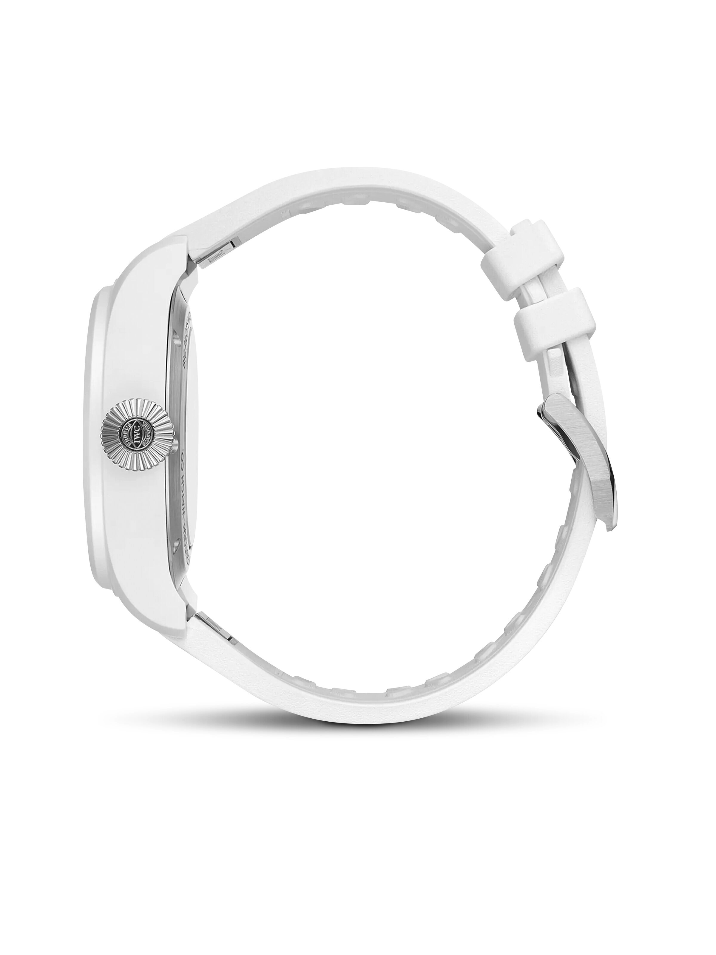 Die IWC Big Pilot Ref. IW339601 interpretiert die charakterstarke Fliegeruhr mit einem zeitgemäßen, sportlichen Auftritt. Das 42,9 Millimeter große Gehäuse aus Keramik wirkt markant und leicht zugleich und rahmt ein blaues Zifferblatt, welches mit arabischen Ziffern und Indexen für sofortige Klarheit sorgt. Eine Zentralsekunde erhöht die Präzision beim Ablesen, während ein weißes Kautschukarmband mit Faltschließe für hohen Tragekomfort und einen souveränen Halt am Handgelenk steht. Hinter dem Zifferblatt arbeitet das automatische Manufakturkaliber 82665, dessen Energie für eine beeindruckende Gangreserve von 60 Stunden sorgt. Eine umfassende Datumsfunktion mit Anzeige von Datum, Wochentag, Monat und Jahr unterstreicht den hohen Anspruch an Funktionalität. Saphirglas, das auch den Gehäuseboden einbezieht, verbindet Alltagstauglichkeit mit einem Blick auf die feine Mechanik. Eine Wasserdichtigkeit bis 10 bar rundet den kraftvollen und zugleich modernen Auftritt dieser Keramikuhr ab.