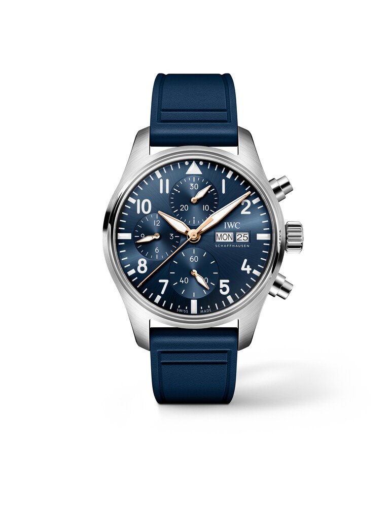 Pilot’s Watch Chronograph 41 Le Petit Prince 41 mm, Edelstahl mit blauem Kautschukarmband, Automatik-Manufakturkaliber 69385 mit Chronographenfunktion, Datumsanzeige und Wochentagsanzeige | Referenz-Nr. IW420118