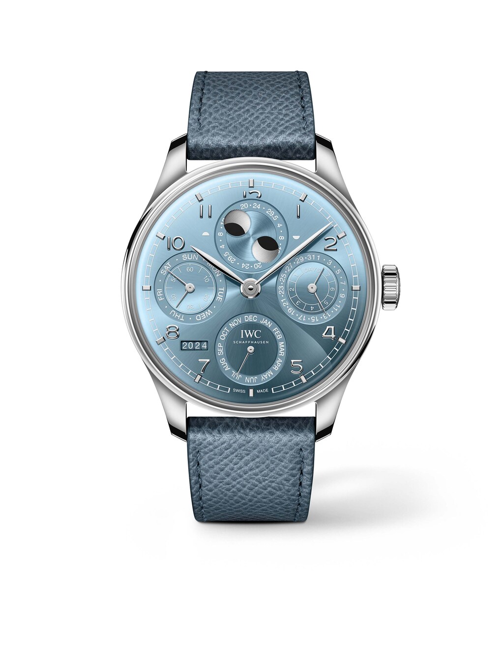 Portugieser Perpetual Calendar 44 44.4 mm, 18k Weißgold mit hellblauem Kalbslederarmband von Santoni, Automatik-Manufakturkaliber 52616 mit Gangreservenanzeige, ewigem Kalender und Mondphasenanzeige | Referenz-Nr. IW120060