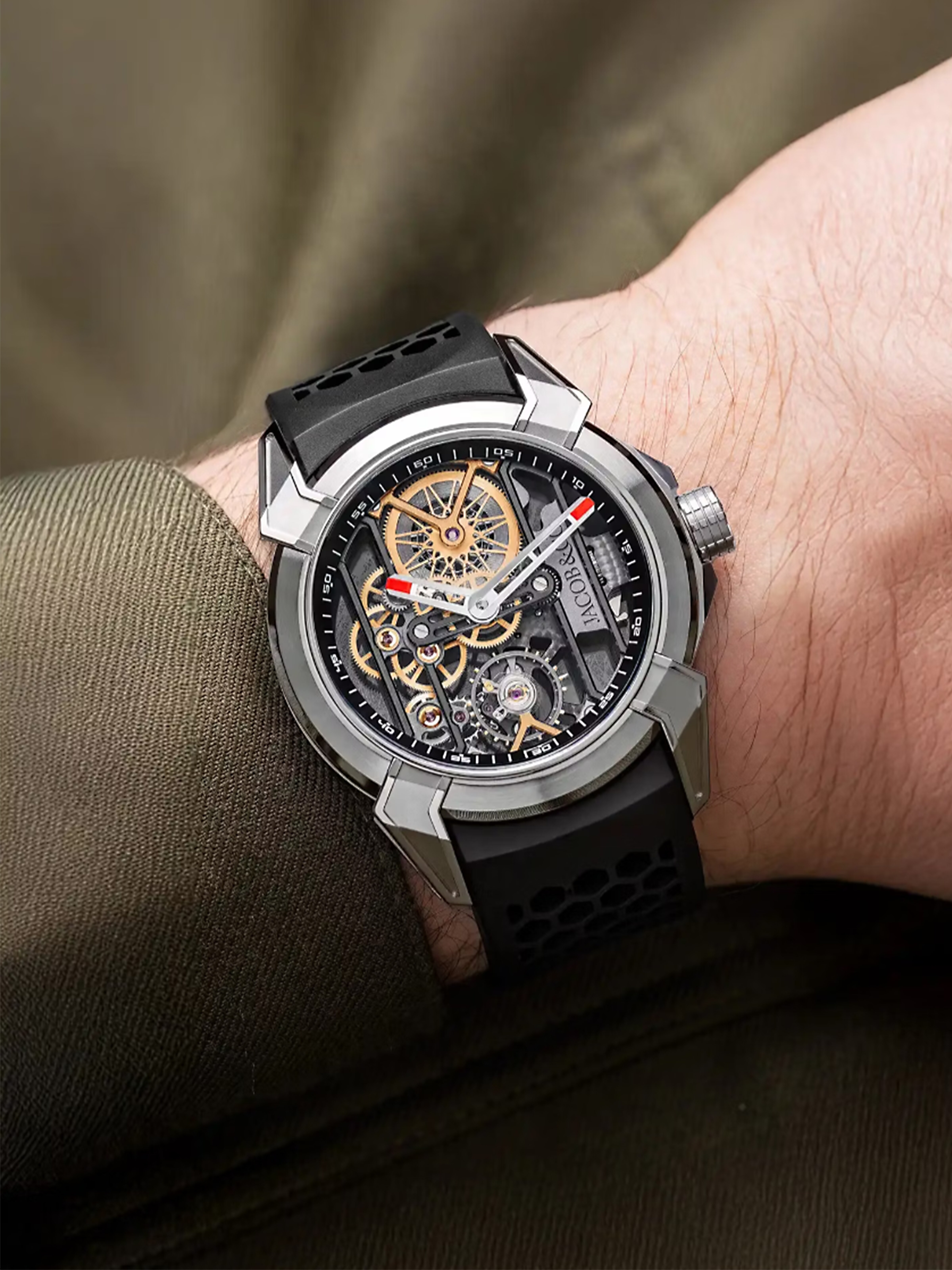 Die Epic X (Ref. EX110.20.AA.AO.ABRUA) von Jacob & Co. ist eine Uhr, die nicht nur die Zeit misst, sondern auch den Puls der Moderne. Mit einem 44 Millimeter großen Gehäuse aus Titan und einem skelettierten Zifferblatt offenbart sie das Herzstück der Uhrmacherkunst: das JCAM02 Kaliber mit Handaufzug, welches eine Gangreserve von 48 Stunden bietet. Die schwarzen Kautschukarmbänder fügen sich nahtlos in das Design ein und garantieren einen hohen Tragekomfort. Die Titanlünette und der Saphirglasboden unterstreichen die hochwertige Verarbeitung und bieten einen Einblick in die komplexe Mechanik. Mit einer Wasserdichtigkeit von 10 bar ist sie für alltägliche Abenteuer gerüstet. Die Kombination aus Index- und arabischen Ziffern auf dem Zifferblatt rundet das avantgardistische Erscheinungsbild ab. Die Epic X ist ein Symbol für technische Finesse und ästhetische Brillanz, eingefangen in einem Zeitmesser, der die Grenzen des Machbaren neu definiert.