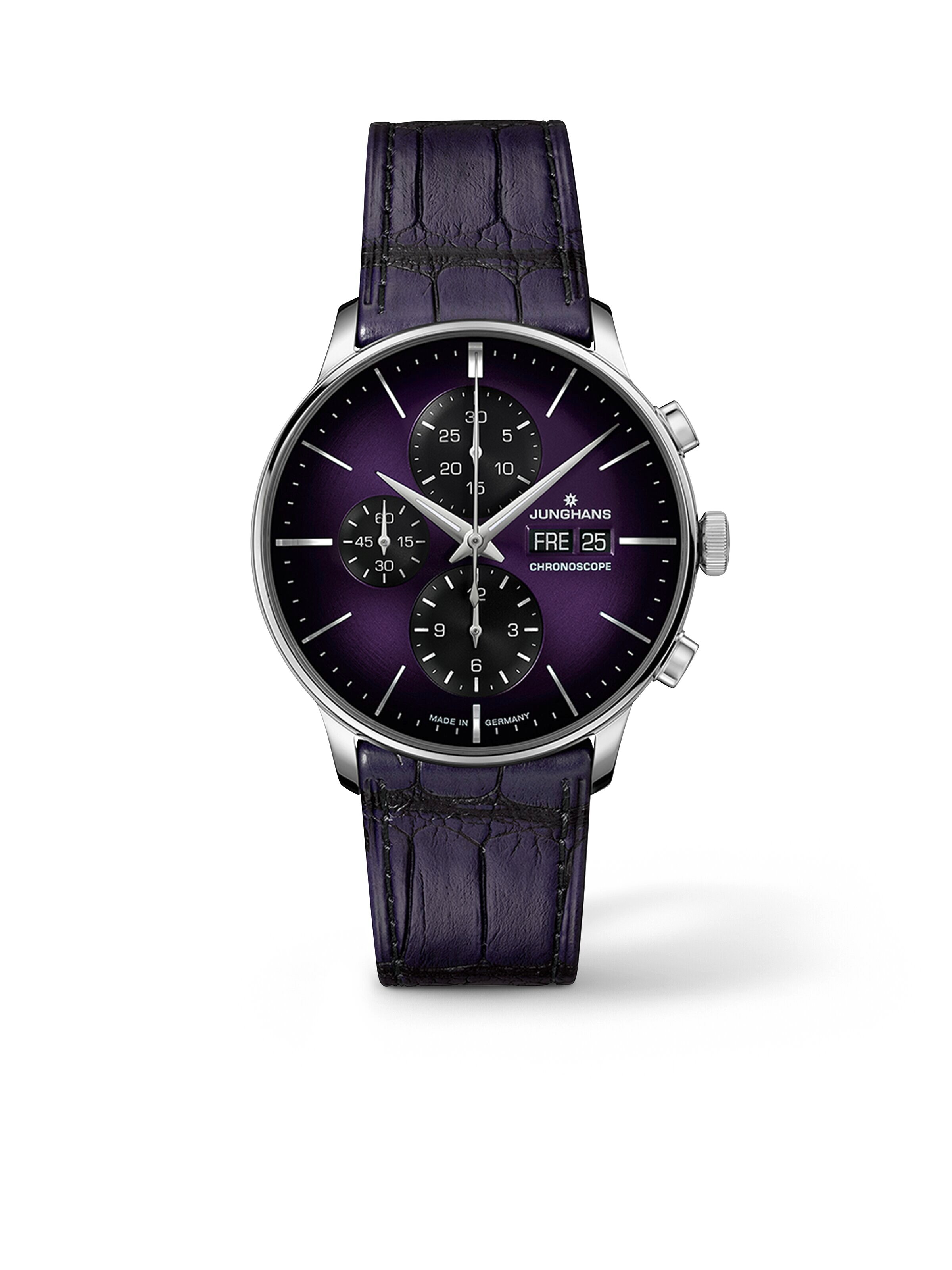 Meister Chronoscope Edition 40,7 mm, Edelstahl mit violettem Alligatorlederarmband, Automatik-Kaliber J880.1 mit Chronographenfunktion, Datumsanzeige und Wochentagsanzeige | Referenz-Nr. JH400032