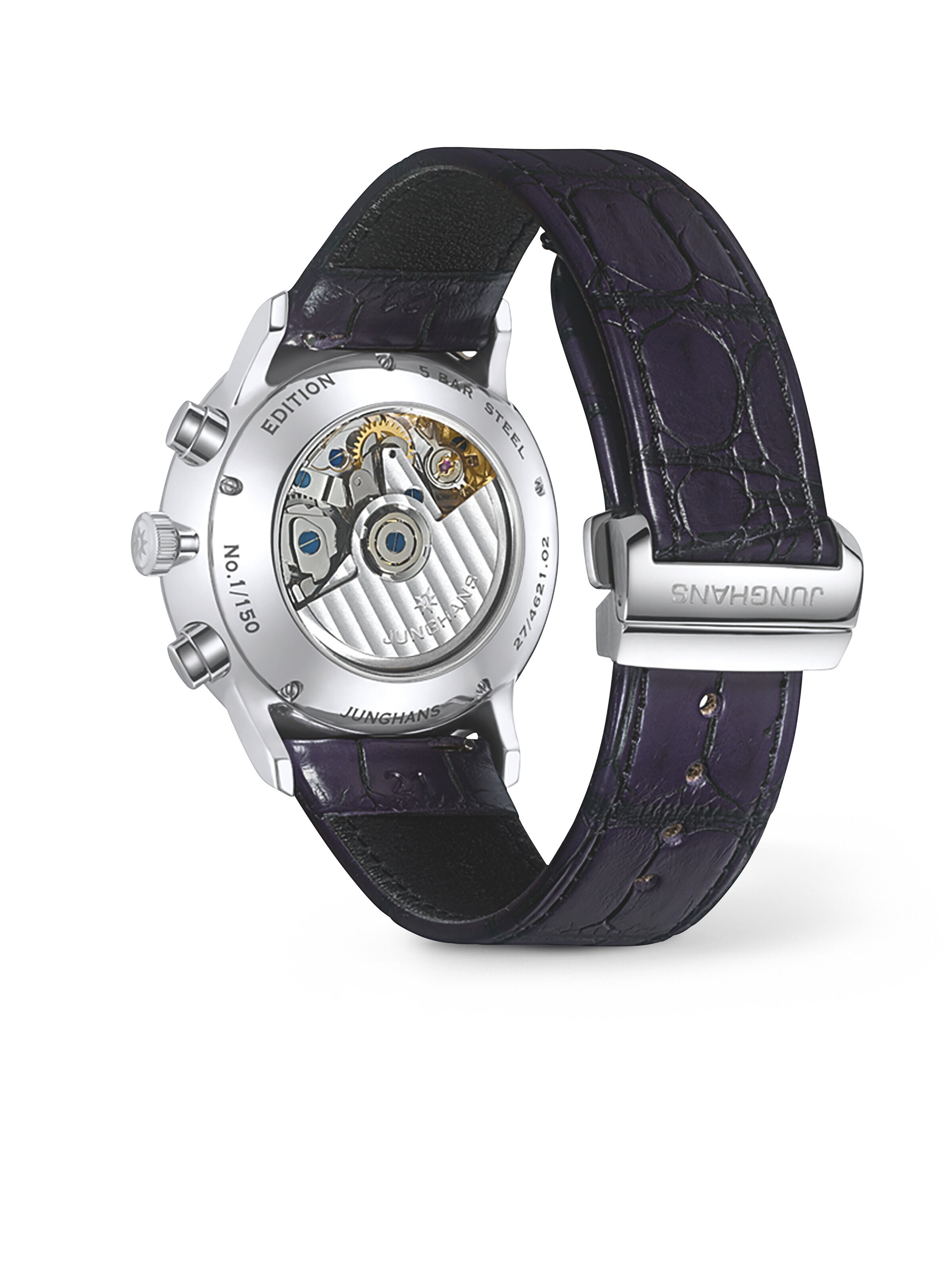 Die Junghans Ref. 027/4621.02 verbindet klassische Chronographenästhetik mit einer markanten Farbgebung, welche Präsenz und Souveränität ausstrahlt. Das violette Zifferblatt mit feiner Indexstruktur und kleiner Sekunde sorgt für eine moderne Note und bleibt dabei angenehm zurückhaltend. Passend dazu schmiegt sich ein Armband aus violettem Alligatorleder an das Handgelenk und unterstreicht den luxuriösen Charakter dieser Uhr. Das Edelstahlgehäuse mit einem Durchmesser von 40,7 Millimeter wirkt am Handgelenk ausgewogen und tritt zugleich präzise proportioniert auf. Im Inneren arbeitet das Automatikwerk J880.1, welches eine Gangreserve von bis zu 48 Stunden bietet. Eine Datumsfunktion mit Anzeige von Datum und Wochentag sorgt für alltagstaugliche Übersicht. Saphirglas, beidseitig entspiegelt, ermöglicht klare Ablesbarkeit aus nahezu jedem Blickwinkel, während ein Gehäuseboden aus Mineralglas den Blick auf das Werk eröffnet. Die Faltschließe erhöht den Tragekomfort und sichert das hochwertige Alligatorleder zuverlässig. Die Limitierung auf 150 Exemplare macht diese Edelstahluhr zu einer exklusiven Wahl. Wasserdicht bis 5 bar begleitet sie stilvoll durch viele Situationen des Alltags.