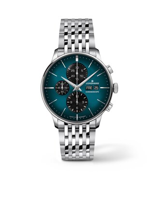 Die Junghans Ref. 027/4622.46 verbindet Eleganz mit souveräner Technik. Das harmonisch proportionierte Gehäuse mit einem Durchmesser von 40,7 Millimeter aus Edelstahl und das fein abgestimmte Edelstahlarmband mit Faltschließe sorgen für ein ausgewogenes Tragegefühl und einen stimmigen, modernen Auftritt. Das petrolfarbene Zifferblatt wirkt markant und zugleich zurückhaltend und bietet mit klaren Indizes sowie einer kleinen Sekunde eine sehr gut strukturierte Ablesbarkeit. Im Inneren arbeitet das Automatikwerk J880.1, welches eine Gangreserve von bis zu 48 Stunden bereithält und den Alltag unabhängig und komfortabel gestaltet. Die Datumsfunktion mit Anzeige von Datum und Wochentag unterstreicht den Nutzen im täglichen Einsatz. Saphirglas, das beidseitig entspiegelt ist, reduziert Spiegelungen und lässt Details des Zifferblatts präzise zur Geltung kommen. Die Uhr ist bis 5 bar wasserdicht, wodurch sie auch im Kontakt mit Wasser zuverlässig bleibt. Auf nur 150 Exemplare limitiert, besitzt dieses Modell einen ausgesprochen exklusiven Charakter.