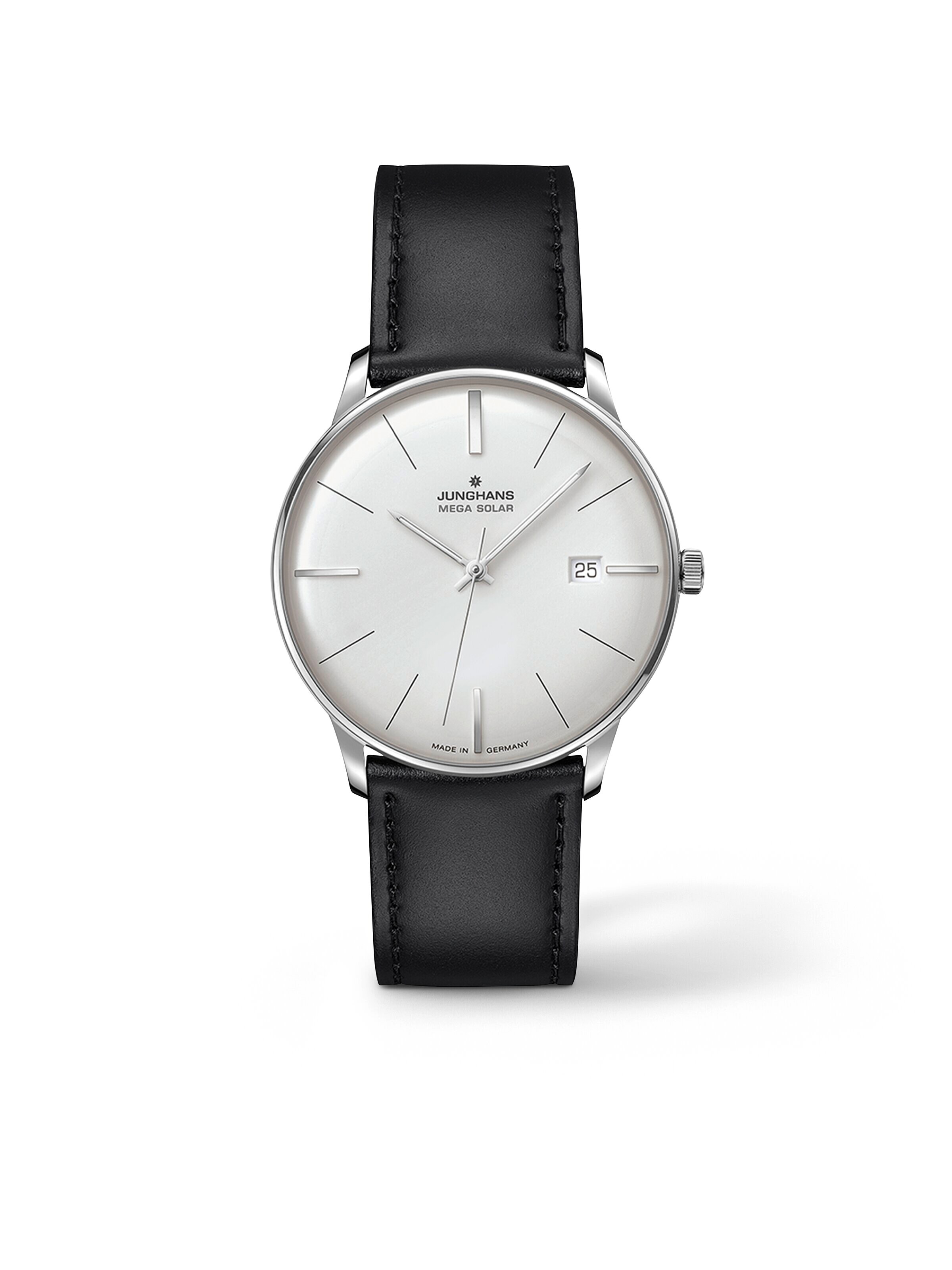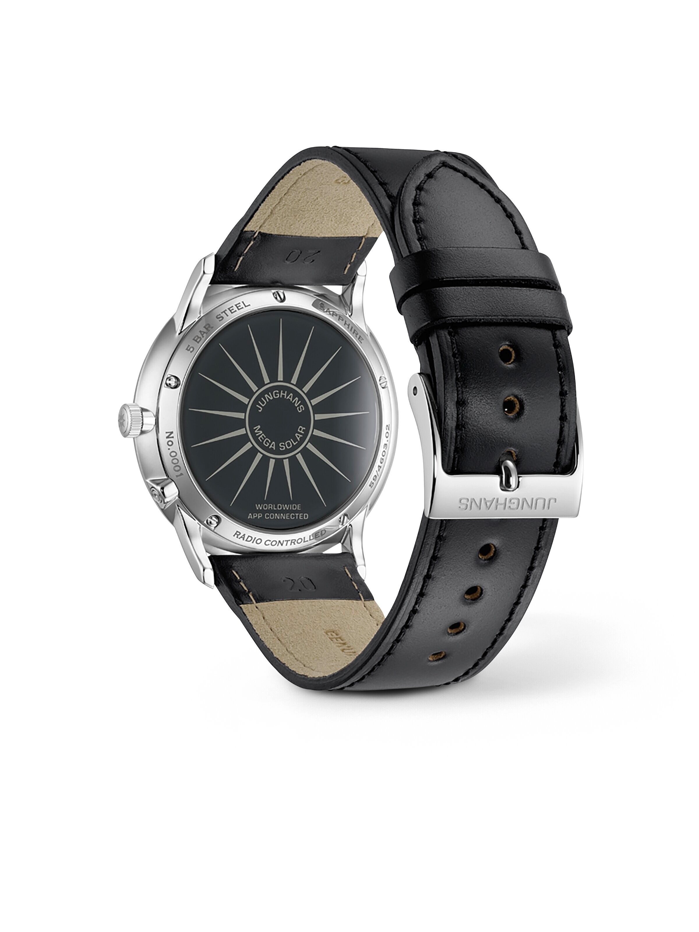 Meister MEGA Solar 38 mm, Edelstahl mit schwarzem Lederarmband, Quarz-Kaliber mit Funkuhrfunktion und Datumsanzeige | Referenz-Nr. JH410020