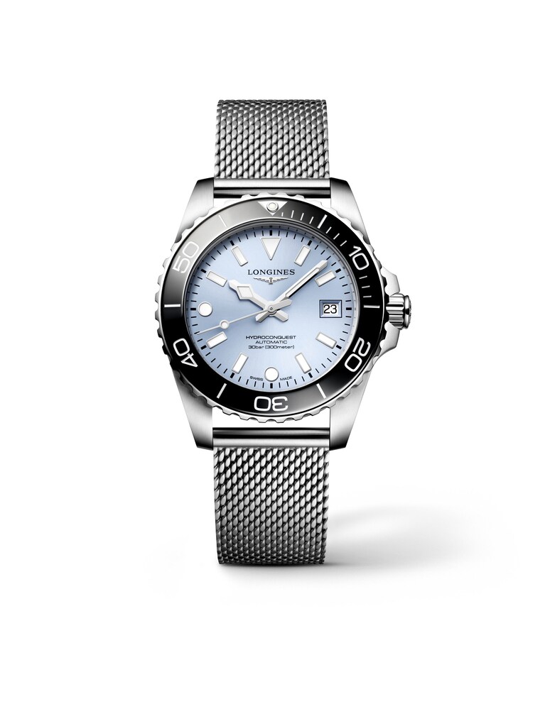 Die Longines HydroConquest Ref. L3.779.4.99.6 verbindet sportliche Souveränität mit eleganter Zurückhaltung. Das hellblaue Zifferblatt sorgt in Kombination mit der farblich abgestimmten Keramiklünette für eine frische, moderne Ausstrahlung, welche sowohl im Alltag als auch bei besonderen Anlässen überzeugt. Mit einem Durchmesser von 39 Millimeter zeigt sich das Edelstahlgehäuse angenehm präsent und zugleich harmonisch proportioniert am Handgelenk. Im Inneren arbeitet das Automatikwerk L888, das eine Gangreserve von bis zu 72 Stunden bietet und zuverlässige Präzision gewährleistet. Eine Wasserdichtigkeit bis 30 bar unterstreicht den funktionalen Charakter und eignet sich ideal für ambitionierte Aktivitäten im Wasser. Datumsanzeige, gut ablesbare Indizes und Zentralsekunde sorgen für eine klare Orientierung auf einen Blick. Saphirglas schützt das Zifferblatt dauerhaft vor Kratzern. Das Edelstahlarmband mit Faltschließe schmiegt sich sicher und komfortabel an und rundet den eigenständigen Auftritt dieser charakterstarken Uhr ab.