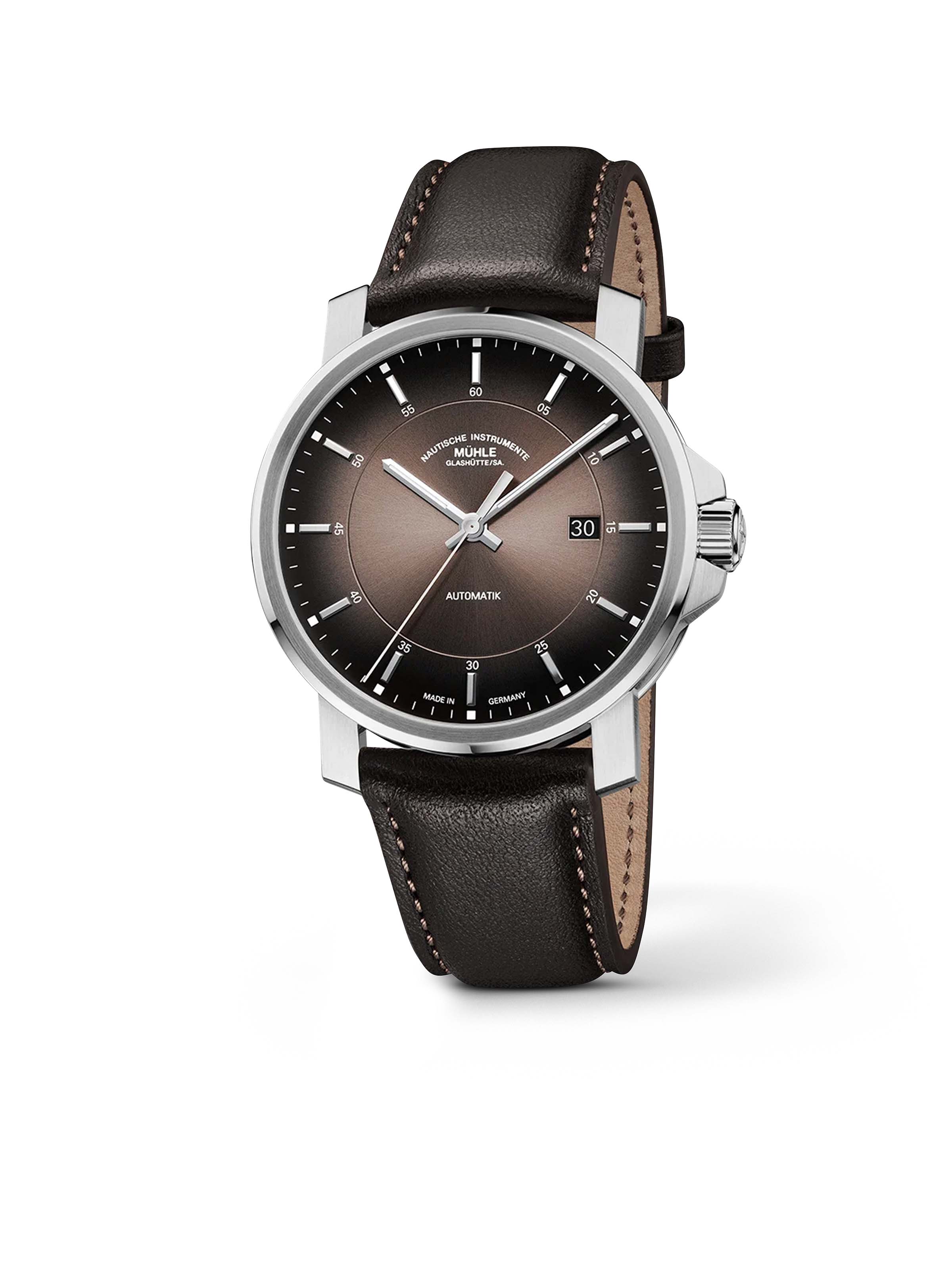 Die 29er Casual Braun von Mühle Glashütte/SA ist eine Uhr, die gekonnt die Balance zwischen funktionalem Design und klassischer Uhrmacherkunst wahrt. Mit einem Gehäusedurchmesser von 42,4 Millimetern richtet sich dieser Zeitmesser an all jene, die Wert auf Präzision und zurückhaltende Eleganz legen. Das braune Zifferblatt, eingebettet in ein robustes Edelstahlgehäuse, verleiht der Uhr eine warme, erdige Ausstrahlung, die durch die harmonische Farbgebung und klare Formensprache unterstrichen wird. Im Inneren arbeitet das Automatik-Kaliber SW 300-1, das mit einer Gangreserve von 56 Stunden und einer Zentralsekunde überzeugt. Die Datumsanzeige ist dezent ins Gesamtbild integriert und macht die Uhr, gemeinsam mit der Wasserdichtigkeit bis 10 bar, zu einem verlässlichen Begleiter im Alltag. Der verschraubte Sichtboden aus Saphirglas erlaubt einen Blick auf das fein veredelte Werk, während das flache Saphirglas auf der Vorderseite Schutz vor äußeren Einflüssen bietet. Die 29er Casual Braun vereint technische Präzision mit stilvoller Zurückhaltung – ein Zeitmesser, der sowohl durch seine Qualität als auch durch sein souveränes Design überzeugt.