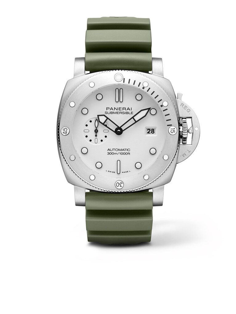Submersible QuarantaQuattro Bianco - 44 mm 44 mm, Edelstahl mit grünem Kautschukarmband, Automatik-Kaliber P.900 mit Datumsanzeige und kleiner Sekunde | Referenz-Nr. PA110053