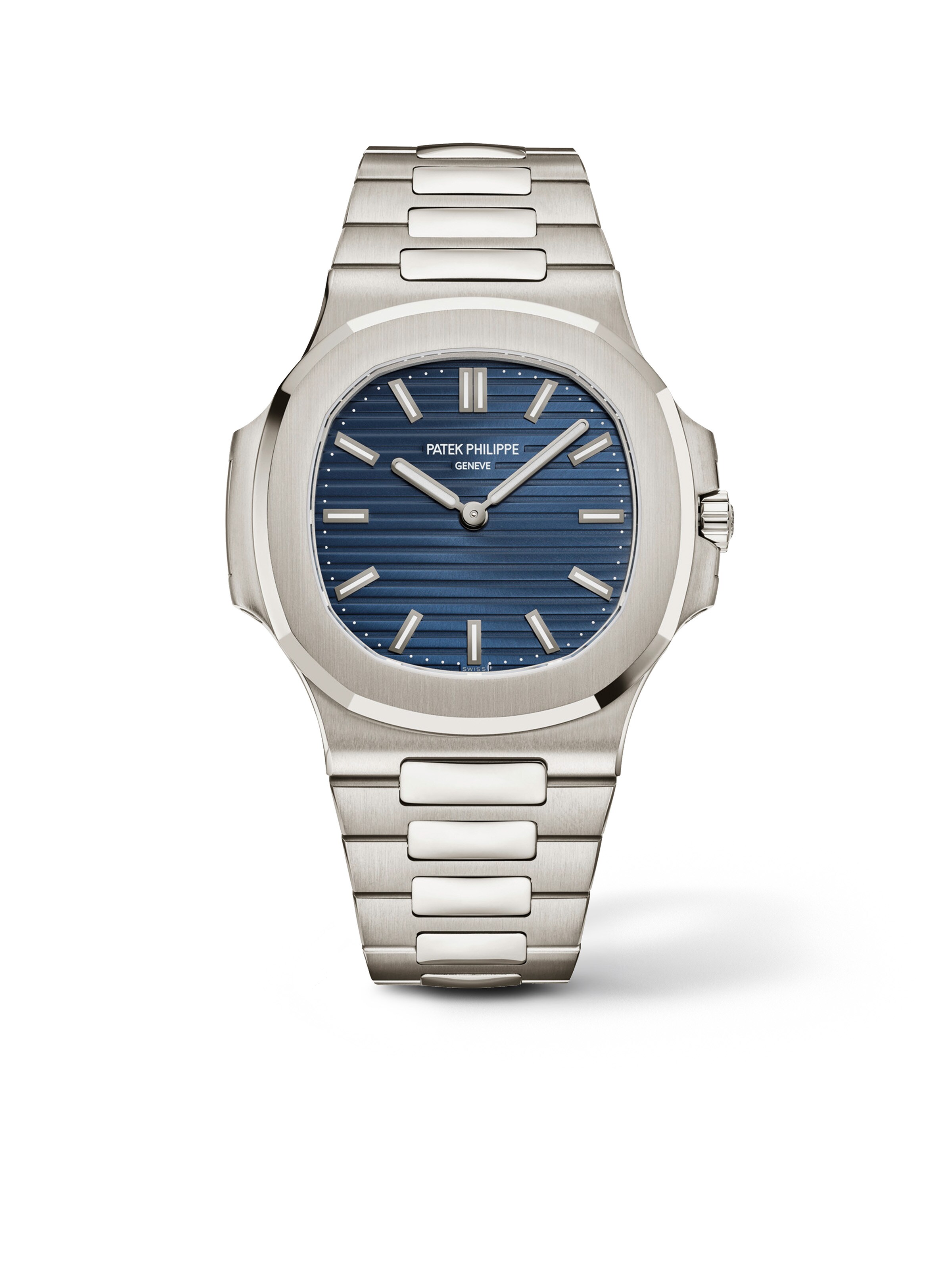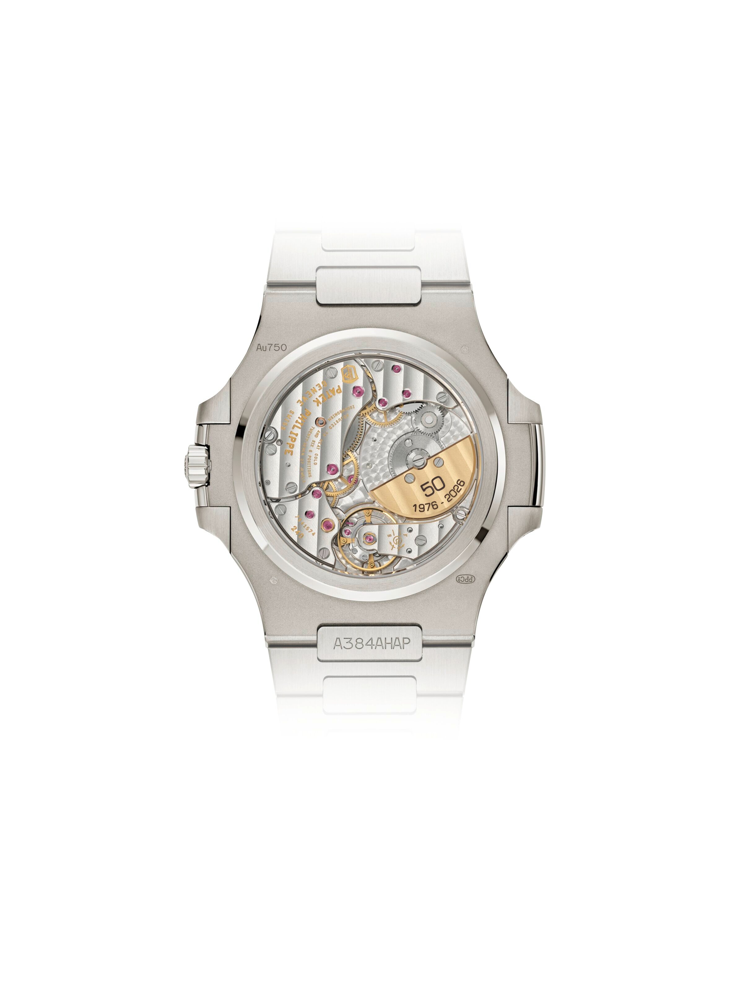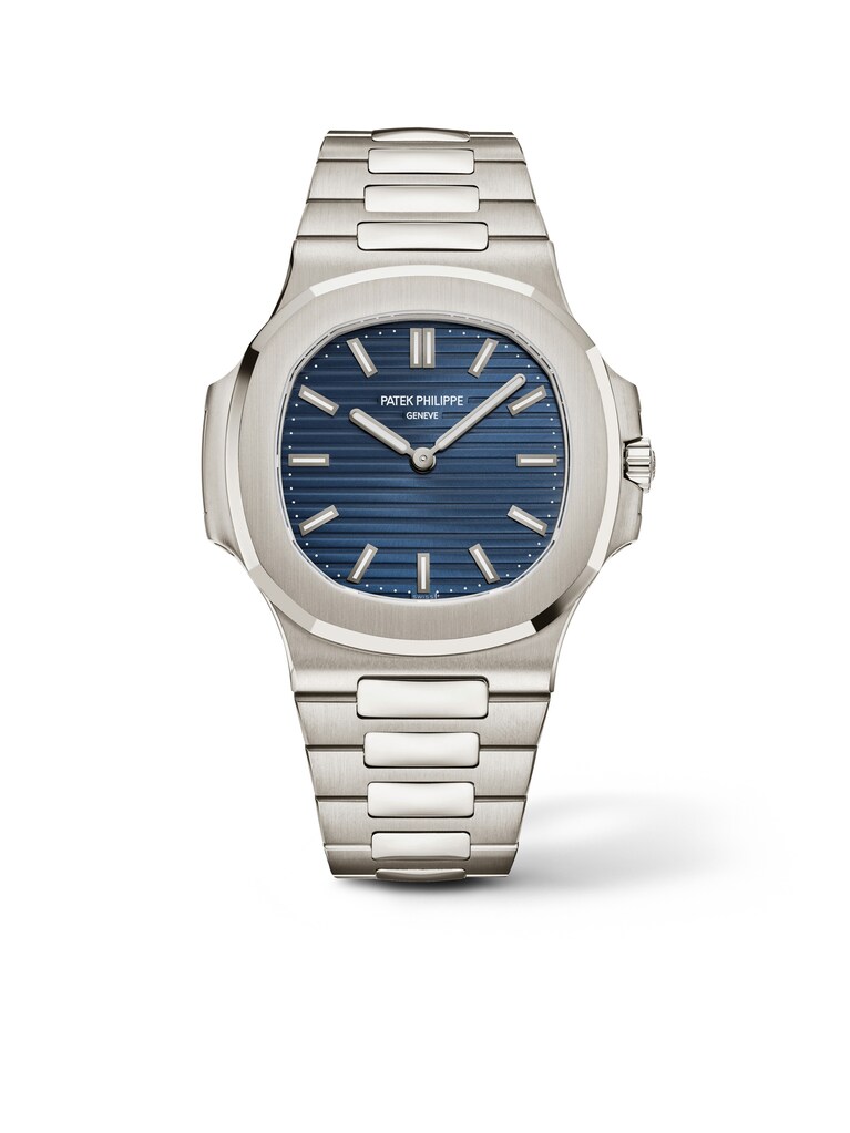 Zum 50-jährigen Jubiläum der Kollektion lanciert Patek Philippe mit der Ref. 5810/1G-001 eine Neuauflage der klassischen Nautilus mit einem ultraflachen Gehäuse aus 18k Weißgold. Die markante achteckige Lünette umrahmt das strahlend blaue Zifferblatt mit dem ikonischen horizontal geprägten Streifendesign. Farblich korrespondieren die aufgesetzten Stabindizes perfekt mit dem bis drei Bar wasserdichten Gehäuse, das im Durchmesser 41 Millimeter groß und 6,9 Millimeter flach ist. Hinter dem blauen Zifferblatt arbeitet das ultradünne automatische Kaliber 240 (nur 2,53 Millimeter hoch) mit einem dezentralen Minirotor aus 22-karätigem Gold, der die Inschrift „50 1976 – 2026“ trägt und durch den Saphirglasboden bewundert werden kann. Das Weißgold-Armband hält den Jubiläumszeitmesser, der in einer limitierten Auflage von 2.000 Exemplaren erscheint, mit dem patentierten Faltverschluss sicher am Handgelenk.