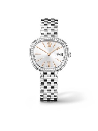 Die Piaget Sixtie, Referenz G0A50300, verkörpert Eleganz in ihrer reinsten Form. Mit einem Durchmesser von 29 Millimetern umschmeichelt diese Damenuhr das Handgelenk und setzt ein klares Statement in Sachen Stil. Das silberne Zifferblatt strahlt unter dem kratzfesten Saphirglas, während das Edelstahlarmband mit seiner Faltschließe nicht nur für einen sicheren Halt sorgt, sondern auch den Glanz dieser Uhr unterstreicht. Im Herzen der Uhr sorgt das Kaliber 57P für die präzise Zeitmessung, welche durch die Quarztechnologie gewährleistet wird. Die Wasserdichtigkeit bis 5 bar macht dieses Schmuckstück zu einem zuverlässigen Begleiter, egal ob im Alltag oder bei besonderen Anlässen. Der Saphirglasboden gewährt einen Blick auf die feine Verarbeitung, die Piaget in dieser Uhr vereint hat. Mit der Sixtie präsentiert Piaget eine Uhr, die nicht nur die Zeit misst, sondern Momente veredelt.
