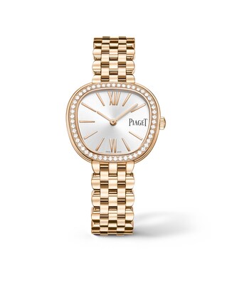 Die Sixtie von Piaget, eine Messeneuheit, die Eleganz und Präzision in einem atemberaubenden Design vereint. Mit ihrem Gehäuse aus 18k Roségold, welches einen Durchmesser von 29 Millimeter aufweist, umschmeichelt sie jedes Damenhandgelenk auf das Feinste. Das silberne Zifferblatt strahlt in schlichter Schönheit, während das Armband aus 18k Roségold mit seiner silbernen Farbe den luxuriösen Gesamteindruck perfekt abrundet. Unter diesem exquisiten Äußeren arbeitet das Quarzwerk Kaliber 57P zuverlässig und präzise. Die Uhr ist bis zu 5 bar wasserdicht, was ihre Alltagstauglichkeit unterstreicht, ohne dabei ihre exquisite Anmutung zu beeinträchtigen. Ein Saphirglasboden bietet Einblick in das Innere des Zeitmessers, während das Saphirglas über dem Zifferblatt höchsten Schutz bietet. Geschlossen wird die Sixtie mit einer eleganten Faltschließe, die den Tragekomfort sicherstellt. Piaget beweist mit diesem Modell erneut, dass wahre Schönheit in der Verbindung von formvollendetem Design und technischer Meisterschaft liegt.