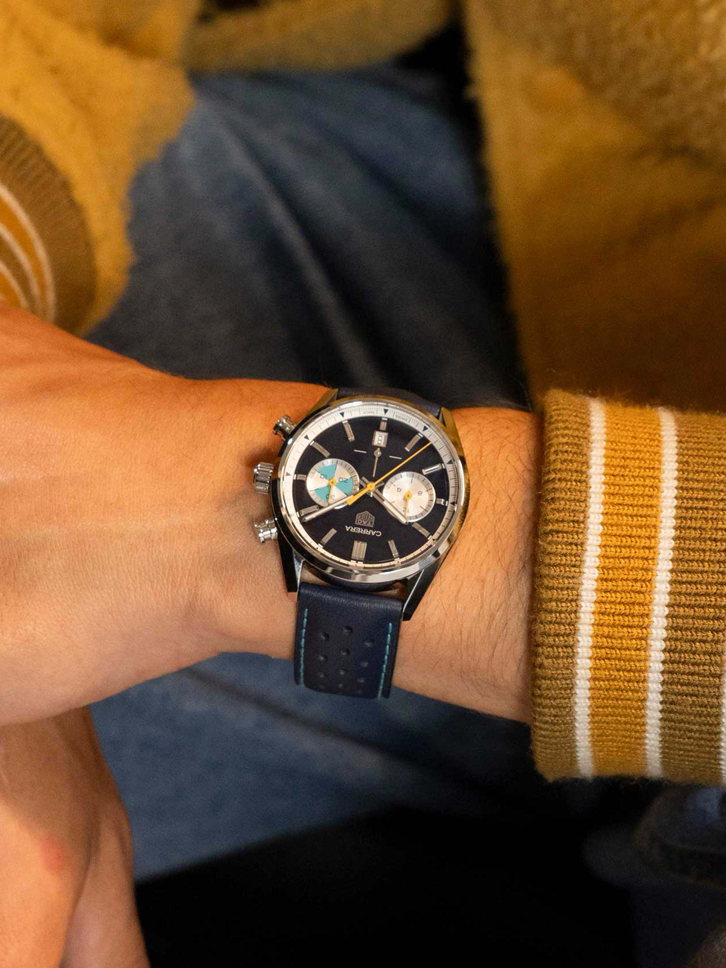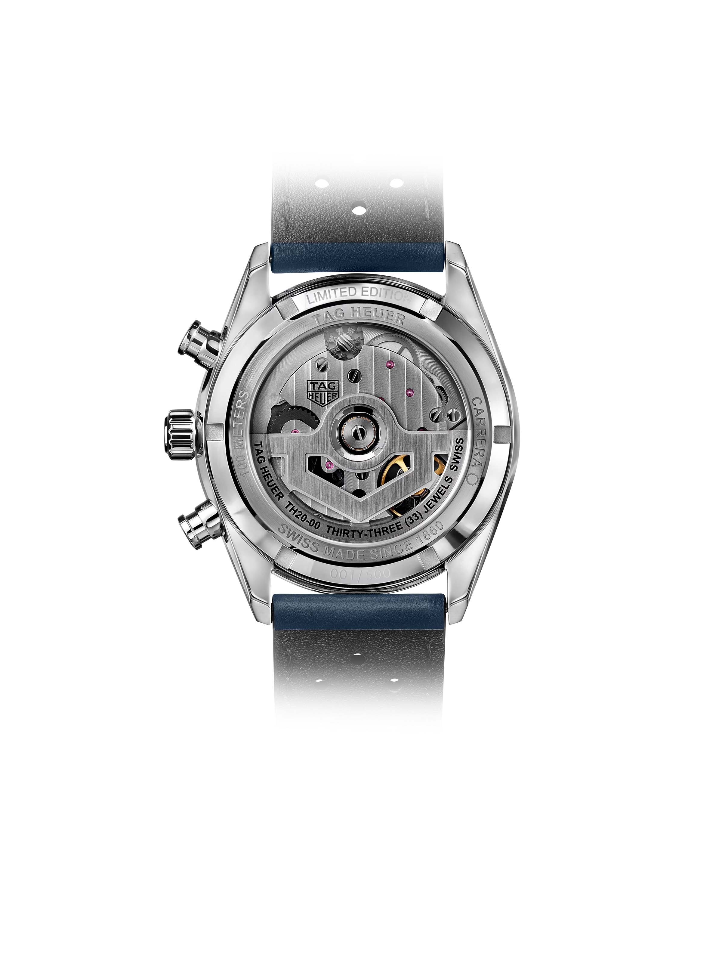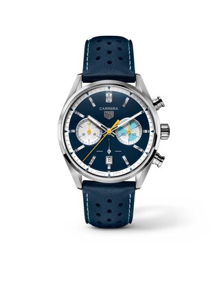 Carrera 2025 42 mm, Edelstahl mit blauem Lederarmband, Automatik-Manufakturkaliber TH20-00 mit Datumsanzeige und Chronographenfunktion, Limitiert auf 500 Exemplare | Referenz-Nr. TH800464