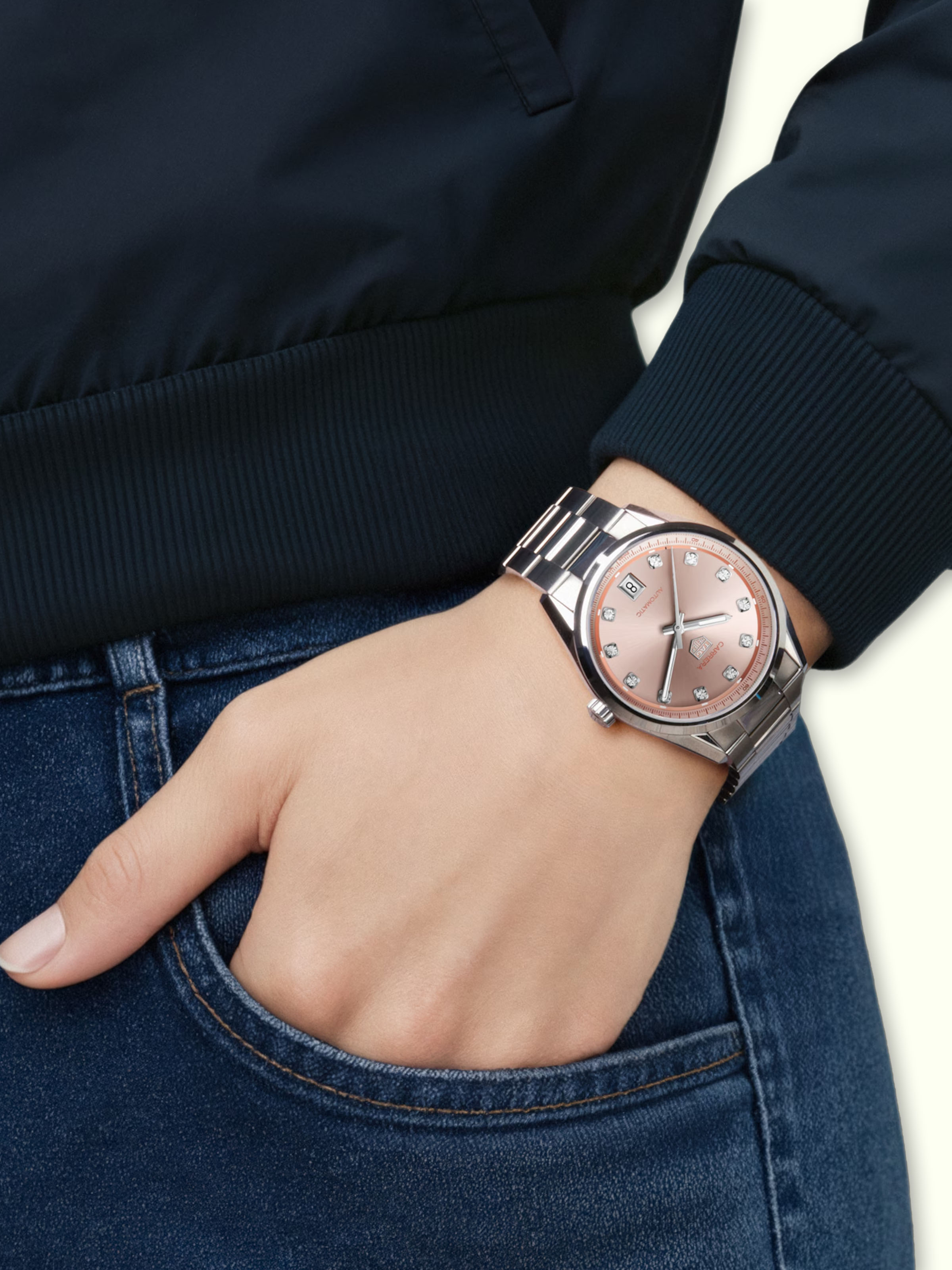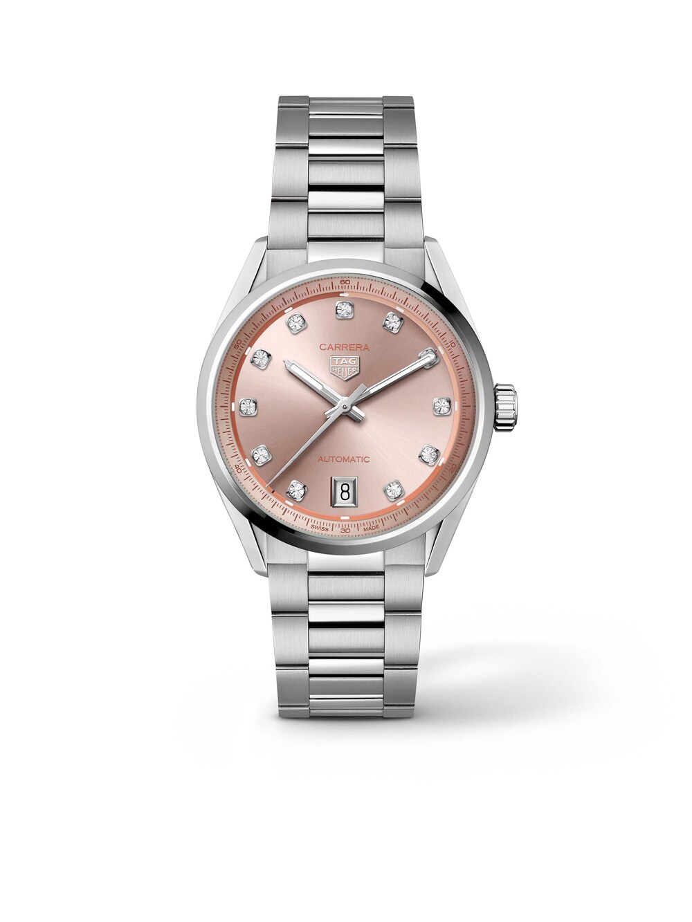 Die TAG Heuer Carrera Lady (Ref. WBN231D.BA0001) ist eine Ode an die Eleganz und Stärke der modernen Frau. Mit ihrem 36 Millimeter großen Edelstahlgehäuse verkörpert sie eine perfekte Balance zwischen Robustheit und femininer Anmut. Das Zifferblatt in einem zarten Rosaton setzt mit Diamantindizes funkelnde Akzente, welche die Zeit auf luxuriöse Weise markieren. Unter diesem glänzenden Antlitz arbeitet das Calibre 7, ein Automatikwerk, das mit einer Gangreserve von 50 Stunden die Zuverlässigkeit und Präzision von TAG Heuer unter Beweis stellt. Die Wasserdichtigkeit bis 10 bar macht sie zu einem vielseitigen Schmuckstück, das nicht nur im Alltag, sondern auch bei besonderen Anlässen getragen werden kann. Ein Saphirglasboden gewährt Einblick in das Herz der Uhr, während das Edelstahlarmband mit Faltschließe für einen sicheren und komfortablen Sitz am Handgelenk sorgt. Die Carrera Lady ist eine Hommage an die zeitlose Schönheit und technische Meisterschaft, die TAG Heuer so einzigartig machen.