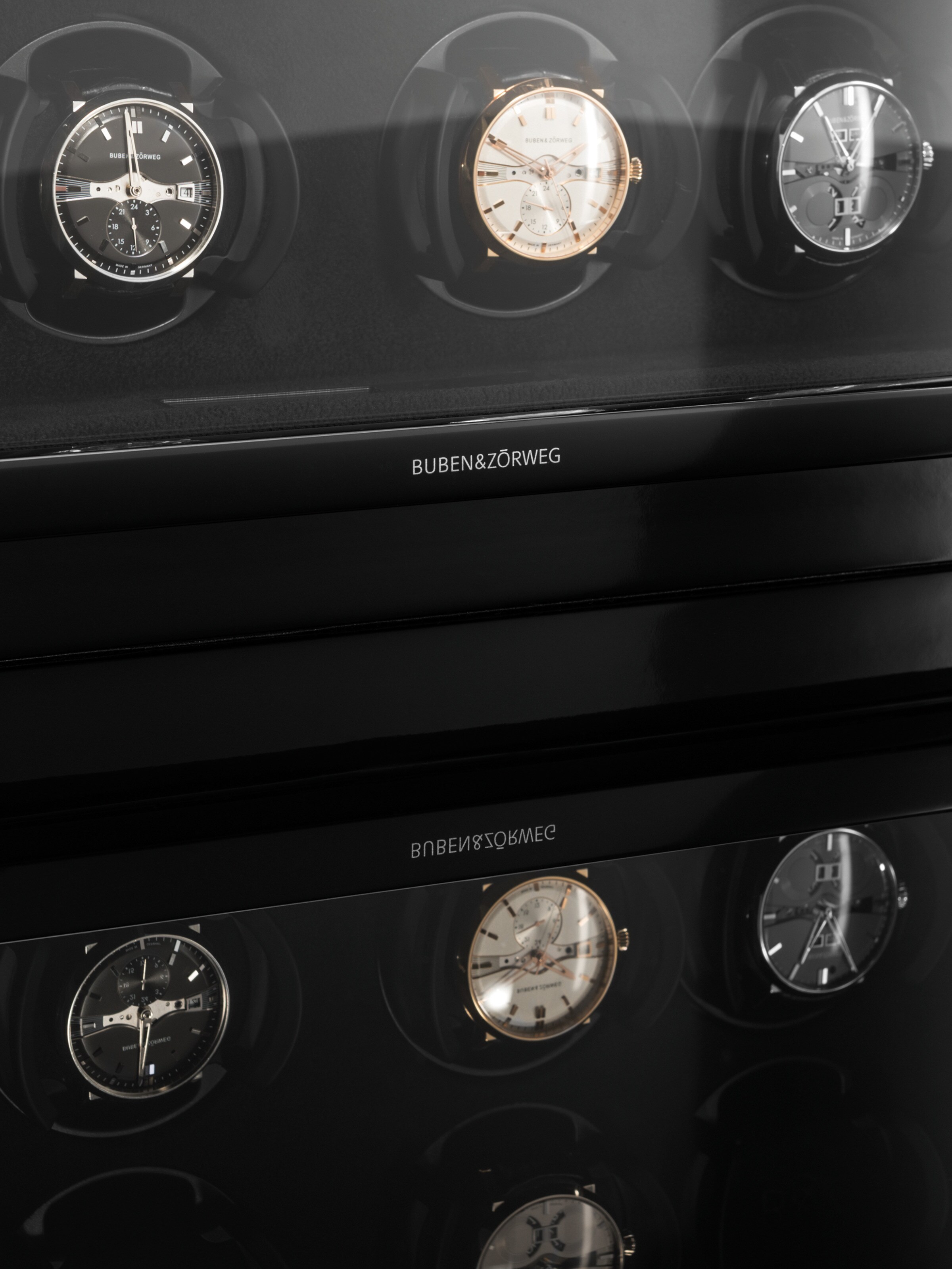 Setzen Sie Ihrer Sammlerleidenschaft mit dem formschönen Buben & Zörweg Vantage 8 Carbon™ (Ref. Vantage 8 Carbon) ein ausdrucksstarkes Statement. In dem handgefertigten Gehäuse aus schwarzem Hochglanzlack und einer Einlage aus Carbon rotieren die aufgenommenen Zeitmesser dank patentierter TIME MOVER® Uhrenbeweger-Technologie konsequent, so dass das erneute Aufziehen und Stellen entfällt. Durch die Glastür hindurch sind Ihre Lieblingsuhren außerdem perfekt in Szene gesetzt und zu jeder Zeit vor Staub geschützt. Diese Ausführung hat die Maßen 24,1 x 45,7 x 24,9 Zentimeter und fasst bis zu acht Uhren gleichzeitig.