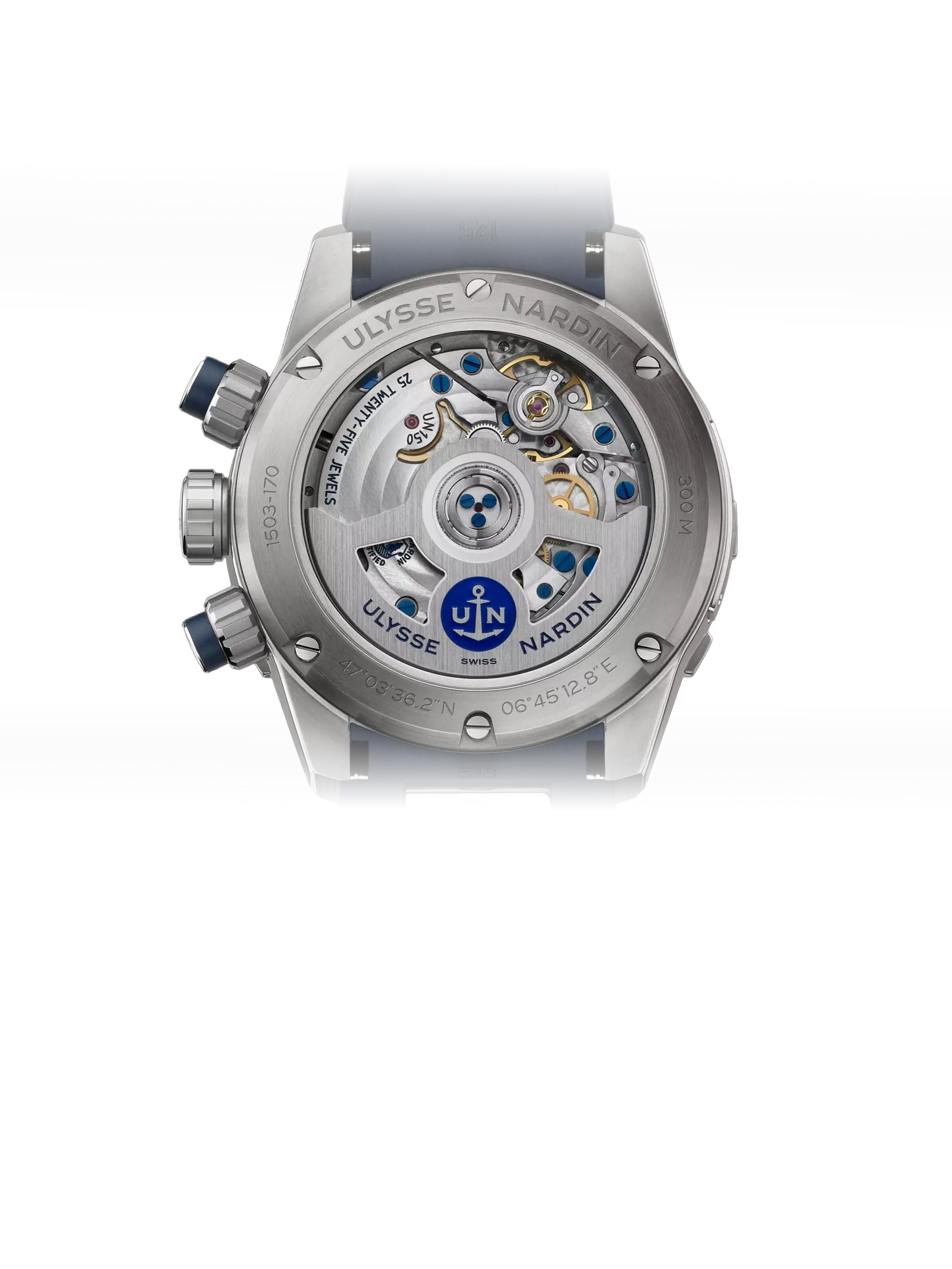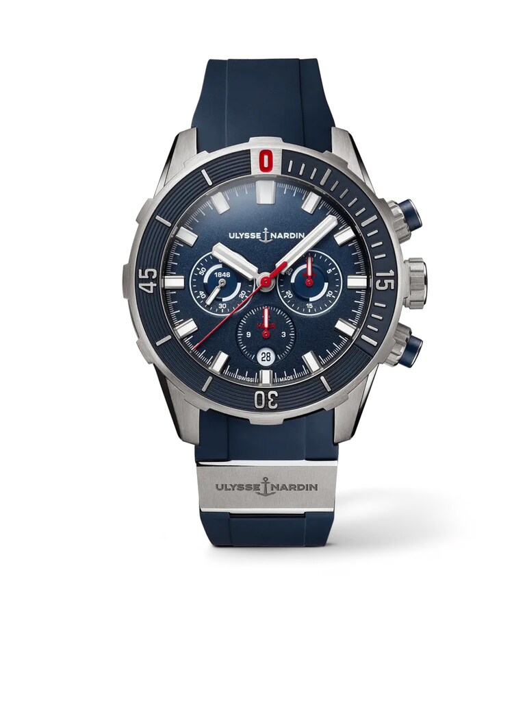 Diver Chronograph 44 mm, Titan mit dunkelblauem Kautschukarmband, Automatik-Manufakturkaliber UN-150 mit kleiner Sekunde, Gangreservenanzeige, Chronographenfunktion und Datumsanzeige | Referenz-Nr. UN200042
