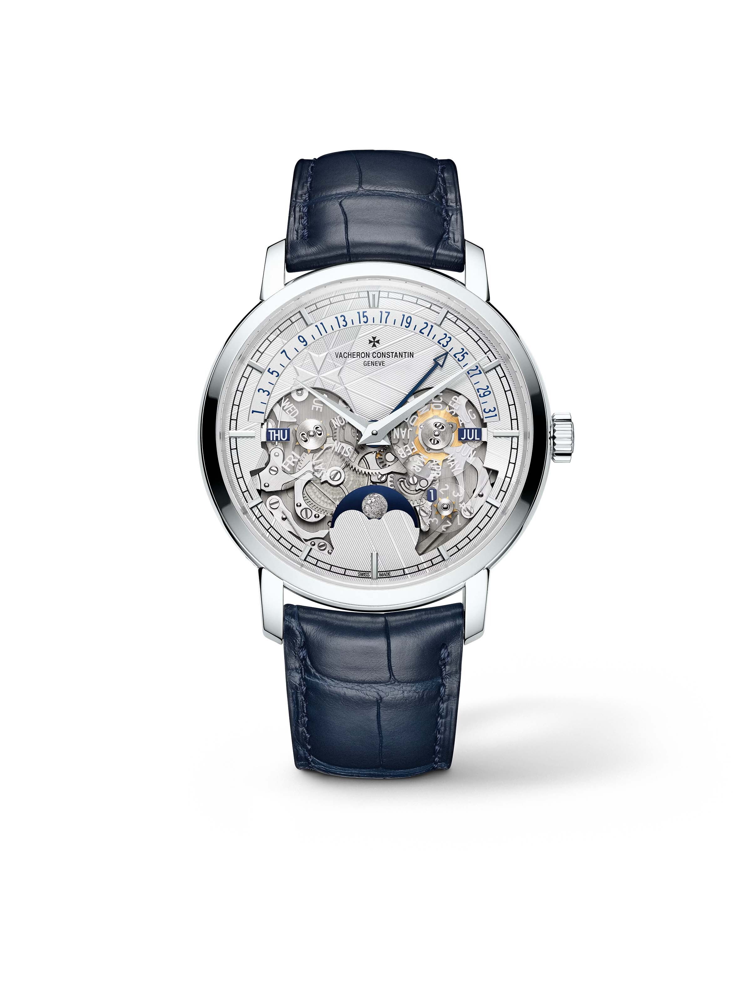 Traditionnelle Ewiger Kalender Retrograde Datumsanzeige Openface 41 mm, Platin mit dunkelblauem Alligatorlederamband, Automatik-Manufakturkaliber 2460 QPR31/270 mit ewigem Kalender, Schaltjahranzeige, Retrograder Datumsanzeige, Monatsanzeige und Mondphasenanzeige | Referenz-Nr. VC210167