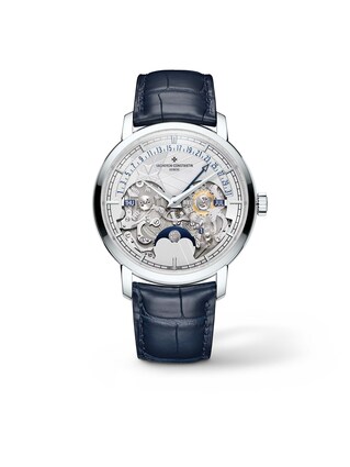 Die Traditionnelle von Vacheron Constantin, eine Messeneuheit, die in ihrer Erscheinung und Funktionalität begeistert, ist ein Meisterwerk der Uhrmacherkunst. Mit einem Gehäuse aus 950 Platin und einem Durchmesser von 41 Millimetern verkörpert sie die Quintessenz luxuriöser Eleganz. Das skelettierte Zifferblatt gewährt einen faszinierenden Einblick in das Herz des Zeitmessers, während das Automatikwerk 2460 QP R31/270 mit einer Gangreserve von 40 Stunden Präzision und Zuverlässigkeit garantiert. Neben der Anzeige von Datum, Wochentag und Monat, verfügt diese außergewöhnliche Uhr über eine Mondphasenanzeige, die den Lauf des Mondes mit poetischer Genauigkeit nachzeichnet. Das Armband aus Alligatorleder in Blau unterstreicht den vornehmen Charakter dieses Stücks. Vollendet wird das Ensemble durch Saphirglas, welches nicht nur Schutz bietet, sondern auch den Blick auf das kunstvolle Innenleben freigibt. Wasserdicht bis 3 bar, ist sie ein Symbol für die Verbindung von Tradition und Innovation, welches Vacheron Constantin meisterhaft zum Ausdruck bringt.