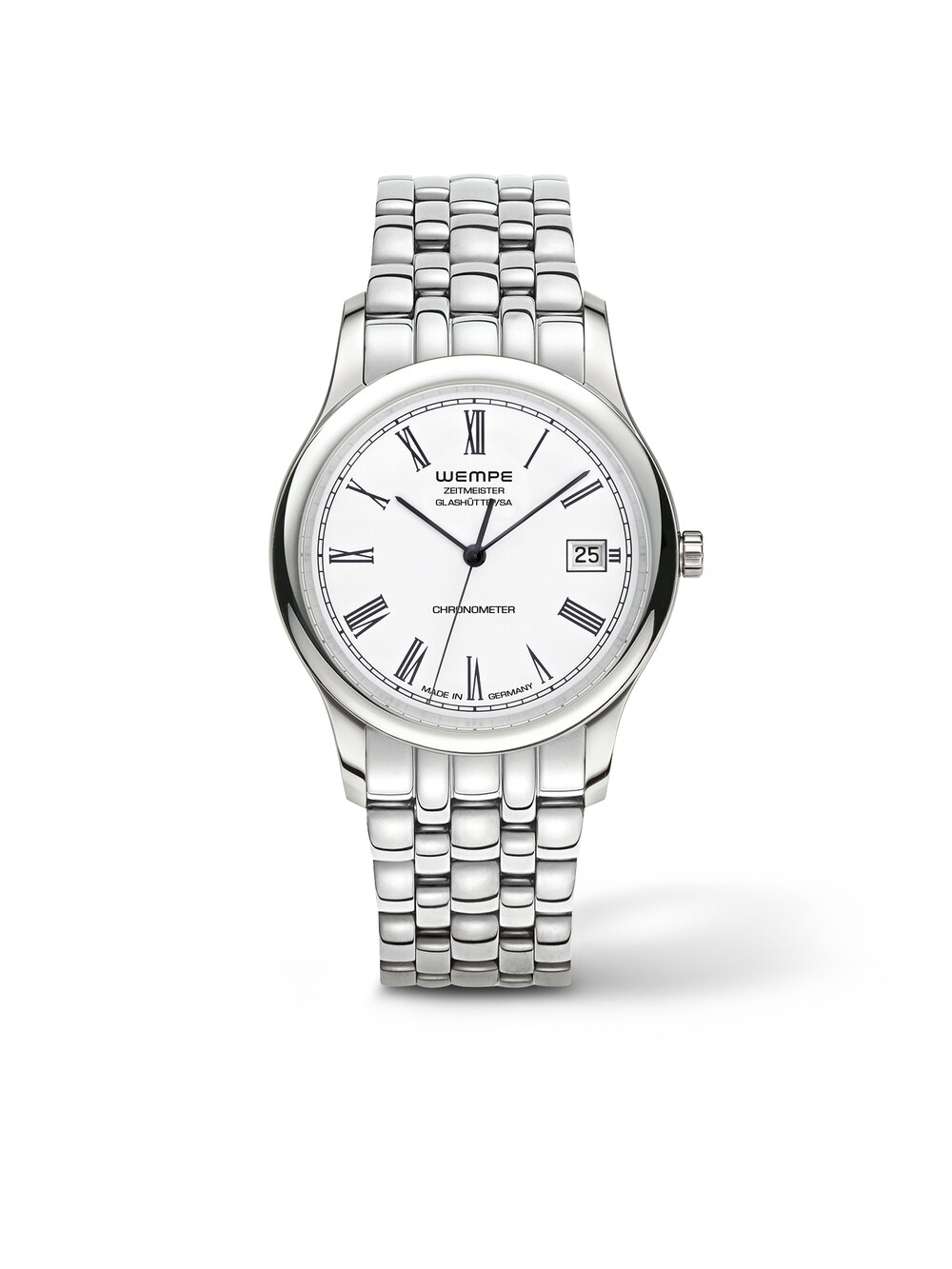 Automatikbetrieben und in unseren Werkstätten in Glashütte/Sachsen geprüft, ist die Zeitmeister Automatik technisch raffiniert. Optisch überzeugt sie mit einer Zentralsekunde in der Mitte des Zifferblattes, römischen Ziffern und einer Datumsanzeige bei drei Uhr. Das Gehäuse: klassisch rund und aus Edelstahl. Damit spricht diese Uhr mit sportlichem Edelstahlarmband eine klare Designsprache und reiht sich mühelos in das Portfolio echter Klassiker ein.