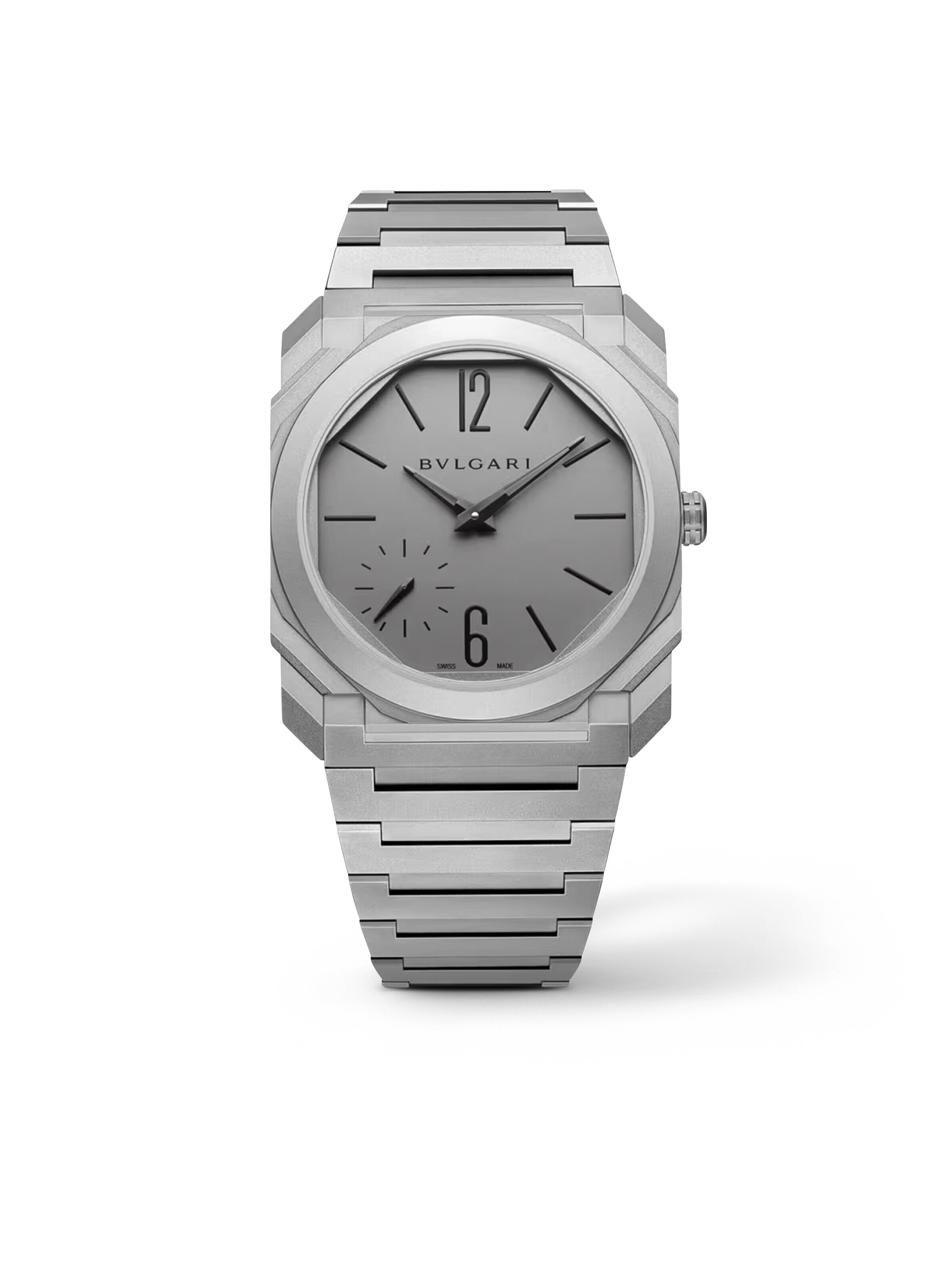 Markante Geometrie und kompromisslose Schlankheit prägen diese Automatikuhr von BVLGARI (Ref. 104089), welche auf 37 Millimeter Durchmesser eine ausdrucksstarke Präsenz entwickelt. Das graue Zifferblatt mit arabischen Ziffern und Indizes wirkt puristisch und klar, die kleine Sekunde setzt einen dezenten, uhrmacherischen Akzent. Das Gehäuse aus Titan verleiht dem Zeitmesser eine moderne, technisch anmutende Leichtigkeit, welche mit dem ebenfalls aus Titan gefertigten Armband zu einer harmonischen Einheit verschmilzt. Eine Faltschließe sorgt für sicheren und zugleich komfortablen Sitz am Handgelenk. Im Inneren arbeitet das automatische Manufakturkaliber BVF 100, das eine beeindruckende Gangreserve von bis zu 72 Stunden bietet. Saphirglas ermöglicht einen ungetrübten Blick auf das Zifferblatt, während der Sichtboden die feine Mechanik eindrucksvoll zur Geltung bringt. Eine Wasserdichtigkeit bis 3 bar rundet die alltagstauglichen Eigenschaften dieses charakterstarken Zeitmessers ab.