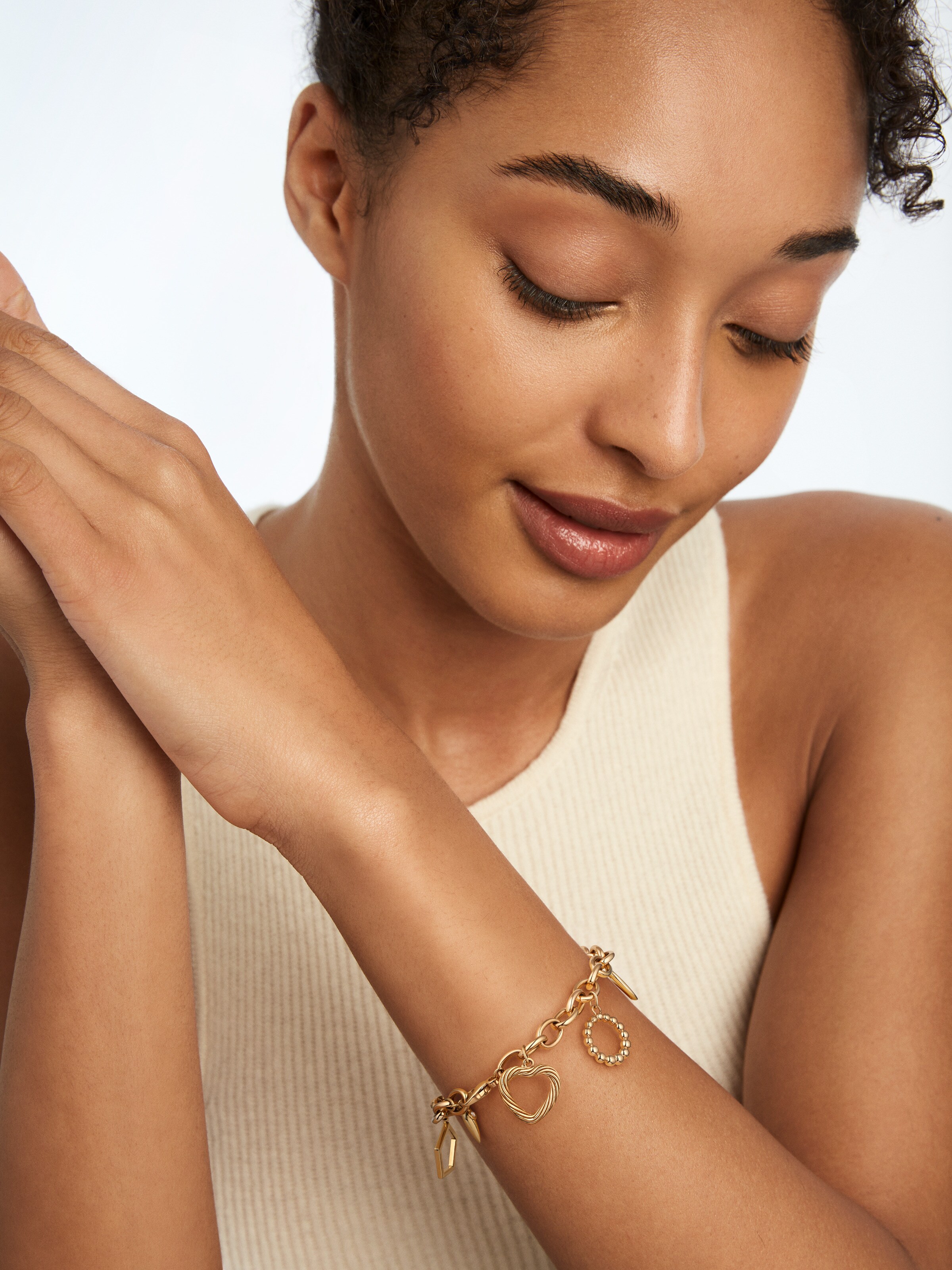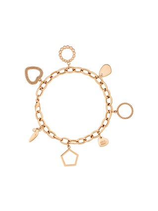 Wheter as a talisman or gift for a special occasion. With its different charms, the Helioro BY KIM bracelet conveys a playful lightness and also represents the best of the BY KIM lines. Rings, hearts, and iconic shapes from the Blu, Helioro, Amor Manet, Playlist, and Sensual lines dangle on the link bracelet made of warm, radiant 18k rose gold. A small round Puntino brilliant-cut diamond adds charming flashes of light. You won't want to be without this enchanting companion.