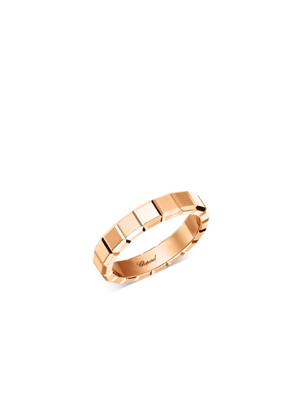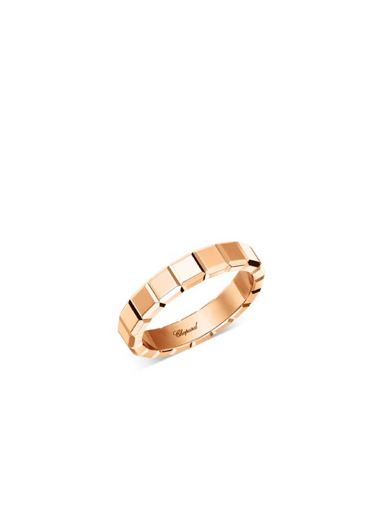 Geometric shapes crafted with masterful artistry. The Ice Cube Medium ring from Chopard presents the brand's signature minimalist design in radiant 18k rose gold. Inspired by tiny ice cubes, the square facets are arranged in a row, elegantly playing with the light. A touch of Art Deco for every look and occasion.