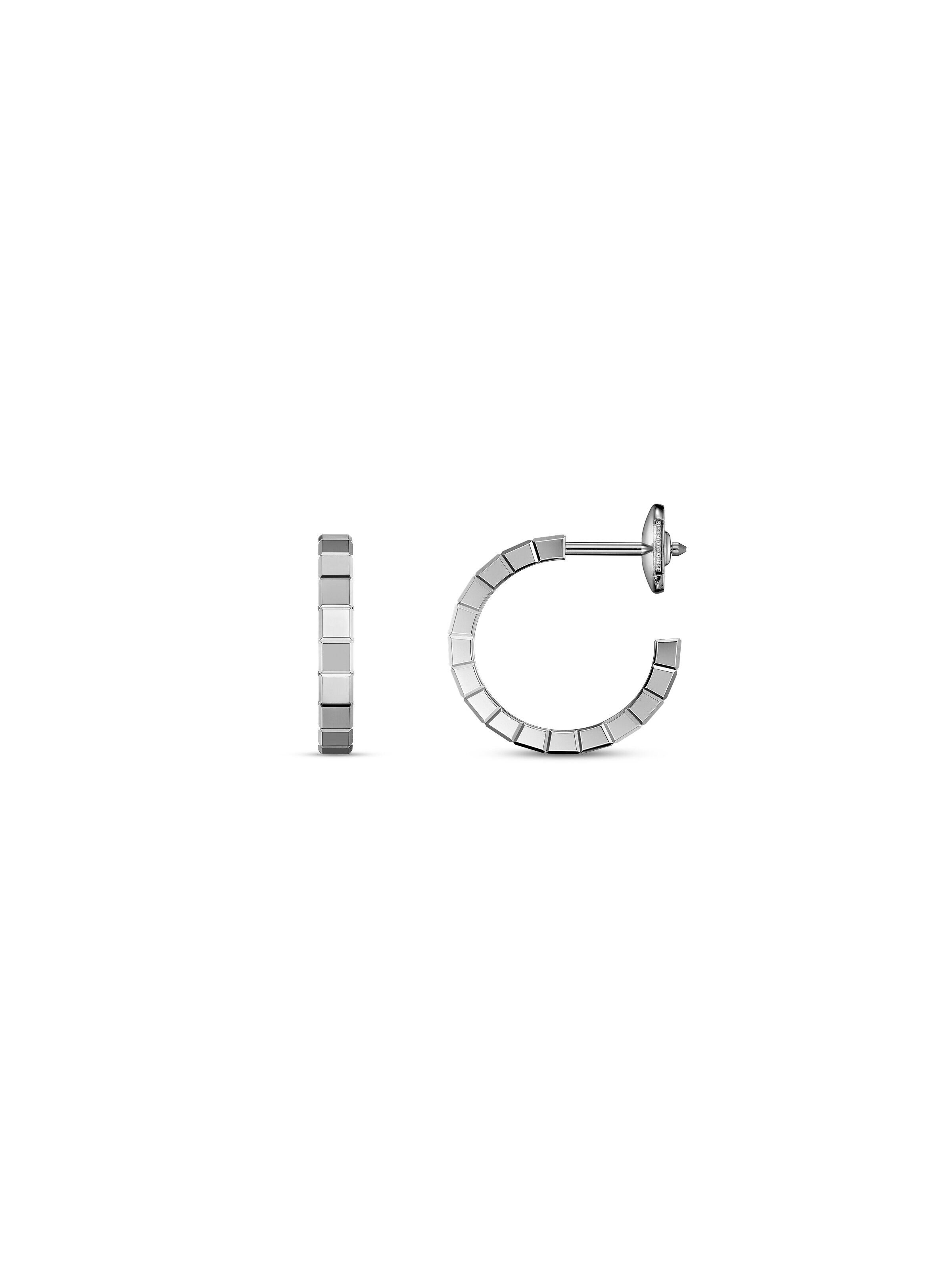 Geometric shapes crafted with masterful artistry. The open Ice Cube Mini hoop earrings from Chopard present the brand's signature minimalist design in radiant 18k white gold. Inspired by tiny ice cubes, the square facets are arranged in a row, elegantly playing with the light. A touch of Art Deco for every look and occasion.