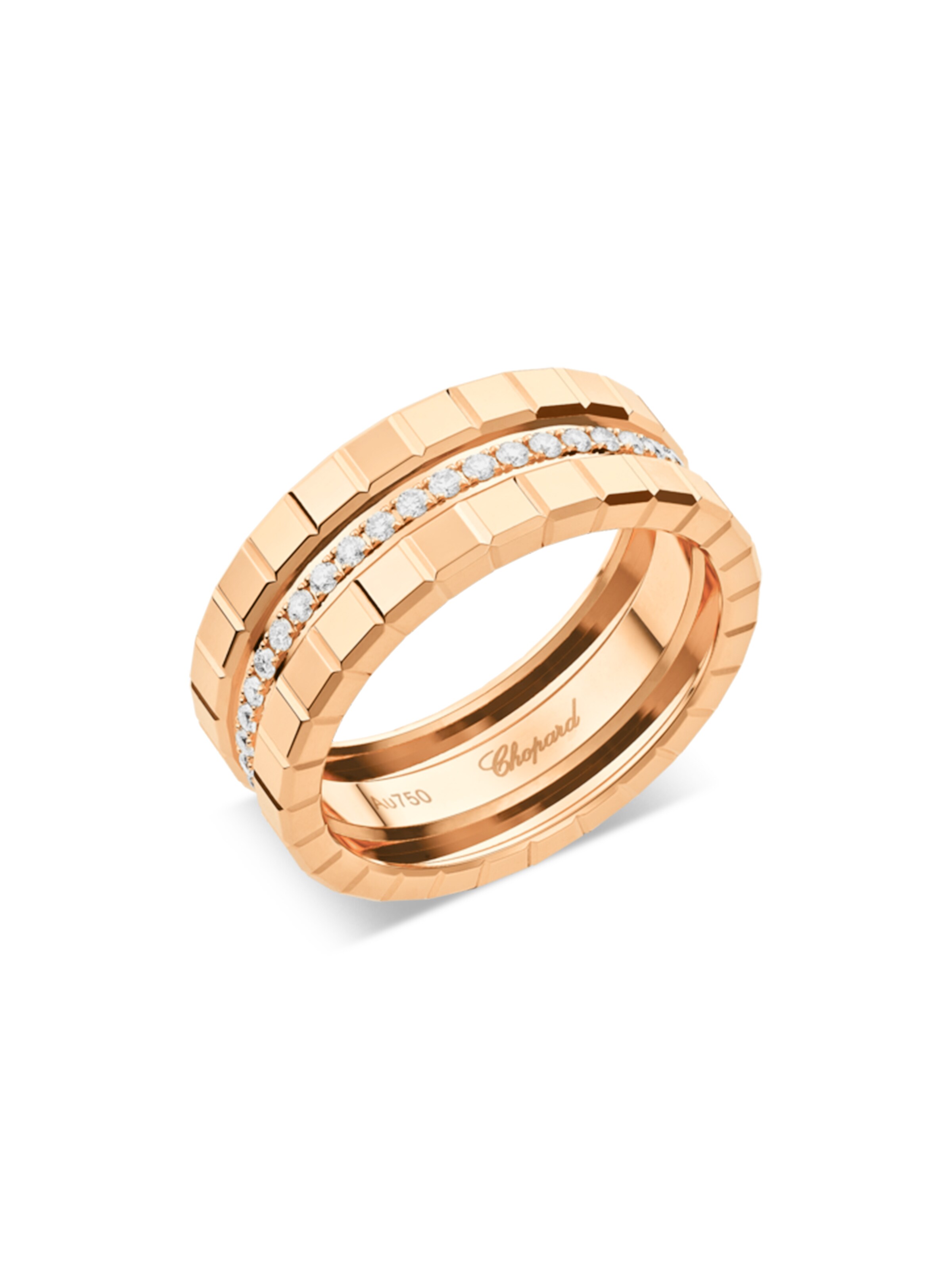 Geometric shapes crafted with masterful artistry. The Ice Cube Mini ring from Chopard presents the brand's signature minimalist design in radiant 18k rose gold. Between the two rows of iconic ice cubes, 47 brilliant-cut diamonds totaling 0.32ct reflect the light, creating an endless sparkle. A touch of Art Deco for every look and occasion.