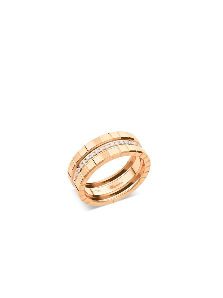Geometric shapes crafted with masterful artistry. The Ice Cube Mini ring from Chopard presents the brand's signature minimalist design in radiant 18k rose gold. Between the two rows of iconic ice cubes, 47 brilliant-cut diamonds totaling 0.32ct reflect the light, creating an endless sparkle. A touch of Art Deco for every look and occasion.