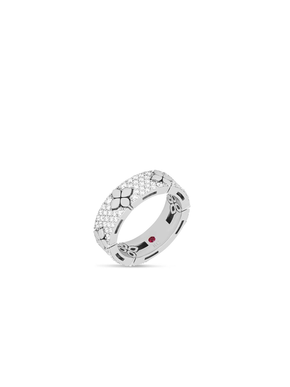 Drawing inspiration from the city of love, Roberto Coin's Love in Verona collection pays homage to minimalist aesthetics and Italian lightness. The romantic look of the Love in Verona ring is defined by sparkling pavé-set diamonds and the Maison's iconic floral motif. A total of 102 brilliant-cut diamonds weighing 0.95 ct adorn the 18k white gold ring, providing a sparkling backdrop for the floral motif. With a width of six millimeters, this bracelet is luxurious and elegant and can be perfectly combined with the bangle and hoop earrings from the collection. A special detail: a small ruby, Roberto Coin's trademark and a symbol of good luck, adorns the inside of the inside of the ring band.