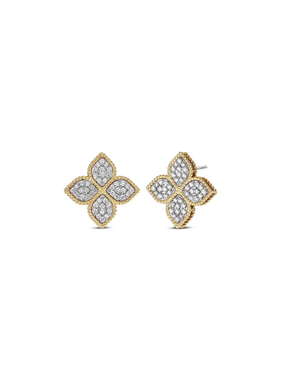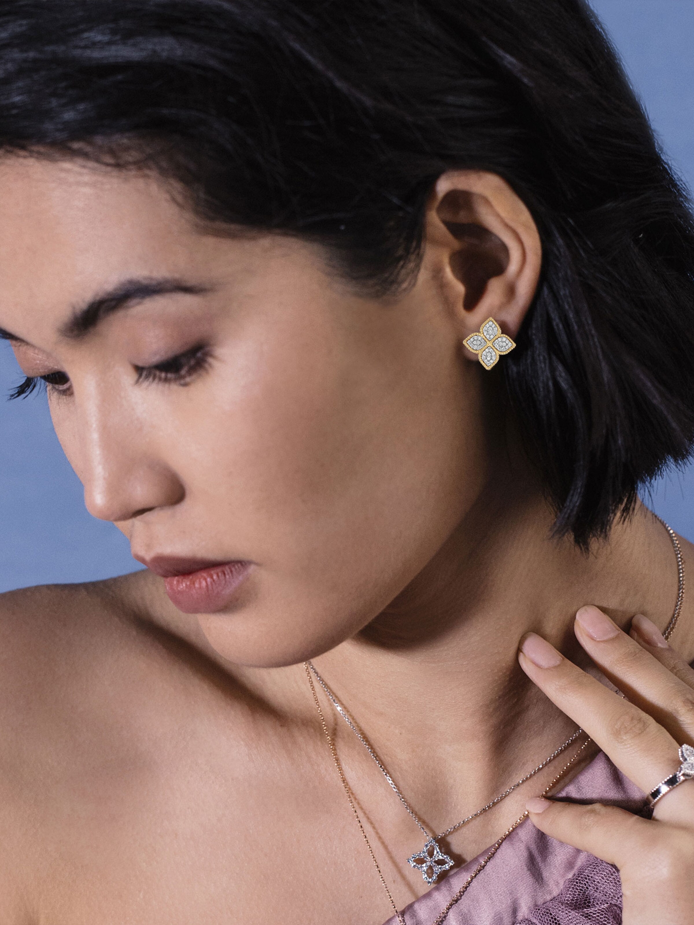 Romantic, feminine, and elegant. Drawing inspiration from the architecture of Venetian palaces, the iconic floral motif of the Princess Flower collection exudes timeless sophistication. The Princess Flower stud earrings by Roberto Coin are handcrafted from the finest 18k yellow gold and feature 88 brilliant-cut diamonds totaling 0.91 ct that sparkle on its petals. The back of the 20 x 20 millimeter earrings conceals a special detail: two small rubies serve as Roberto Coin's "magic signature" and are said to bring good luck.