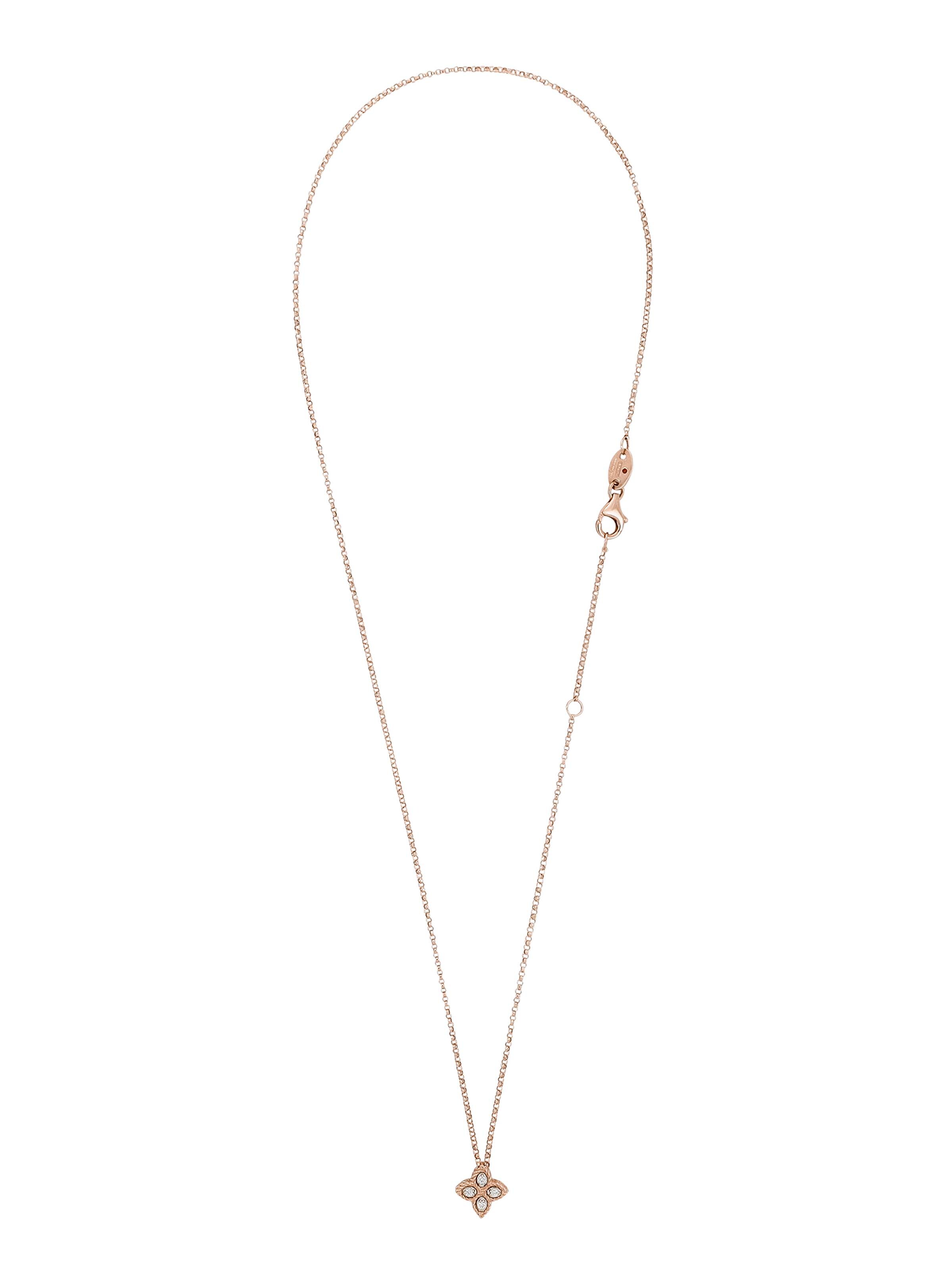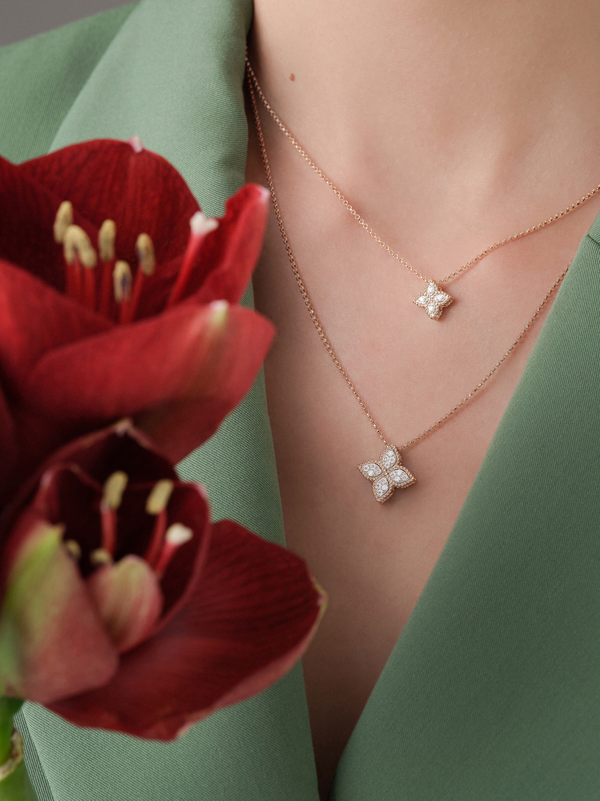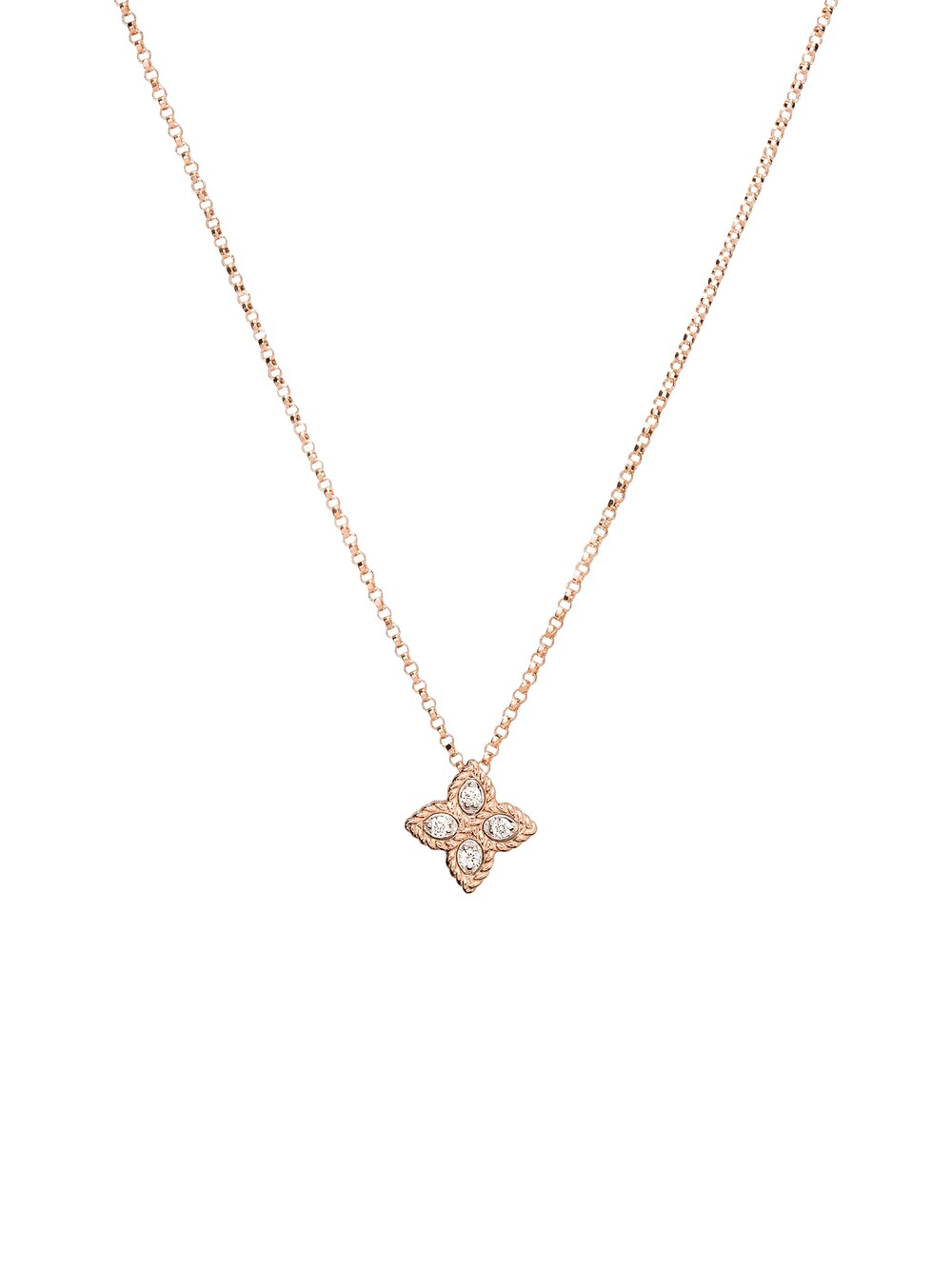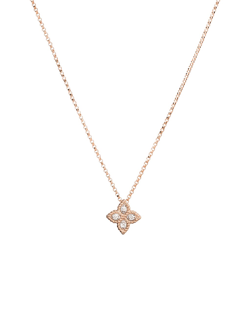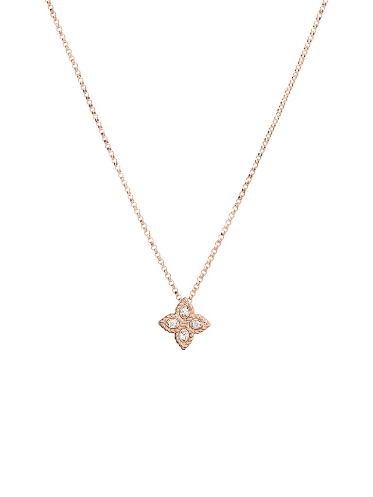 Romantic, feminine, and elegant. Drawing inspiration from the architecture of Venetian palaces, the iconic floral motif of the Princess Flower collection exudes timeless sophistication. The Princess Flower pendant by Roberto Coin is handcrafted from the finest 18k rose gold and features four brilliant-cut diamonds totaling 0.05 ct that sparkle within petals filled with 18k white gold. The clasp of the 45-centimeter chain in 18k rose gold conceals a special detail: a small ruby serves as Roberto Coin's "magic signature" and is said to bring good luck.