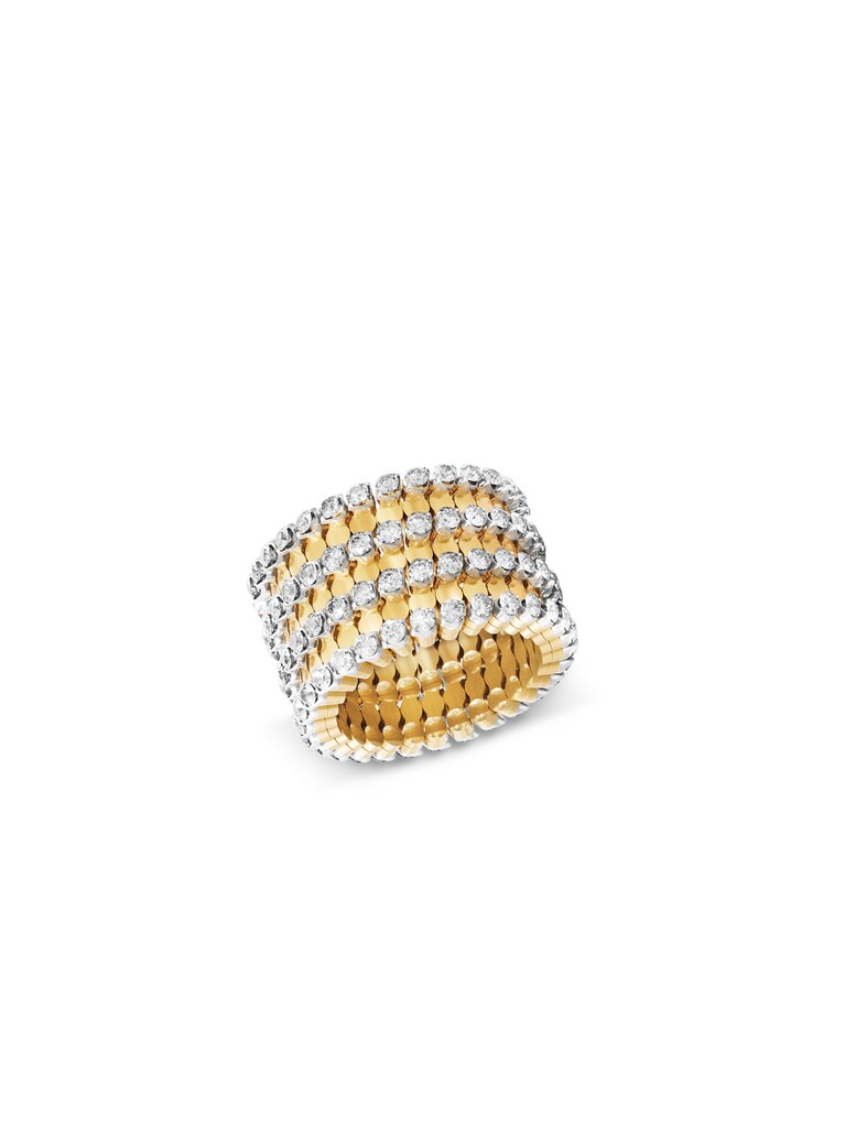 Innovation meets unisex jewelry. The Multisize Serafino Consoli bangle in 18k yellow and white gold can be adjusted to the perfect size thanks to its patented Multisize technology. It also makes a stunning eye-catcher as an opulent ring with a trendy two-tone look. The seven-row design features three rows of smooth and spherical elements in yellow gold alternating with four rows of 116 brilliant-cut diamond totaling 2.15 ct in white gold prong settings. This flexible piece of jewelry also inspires on festive occasions.