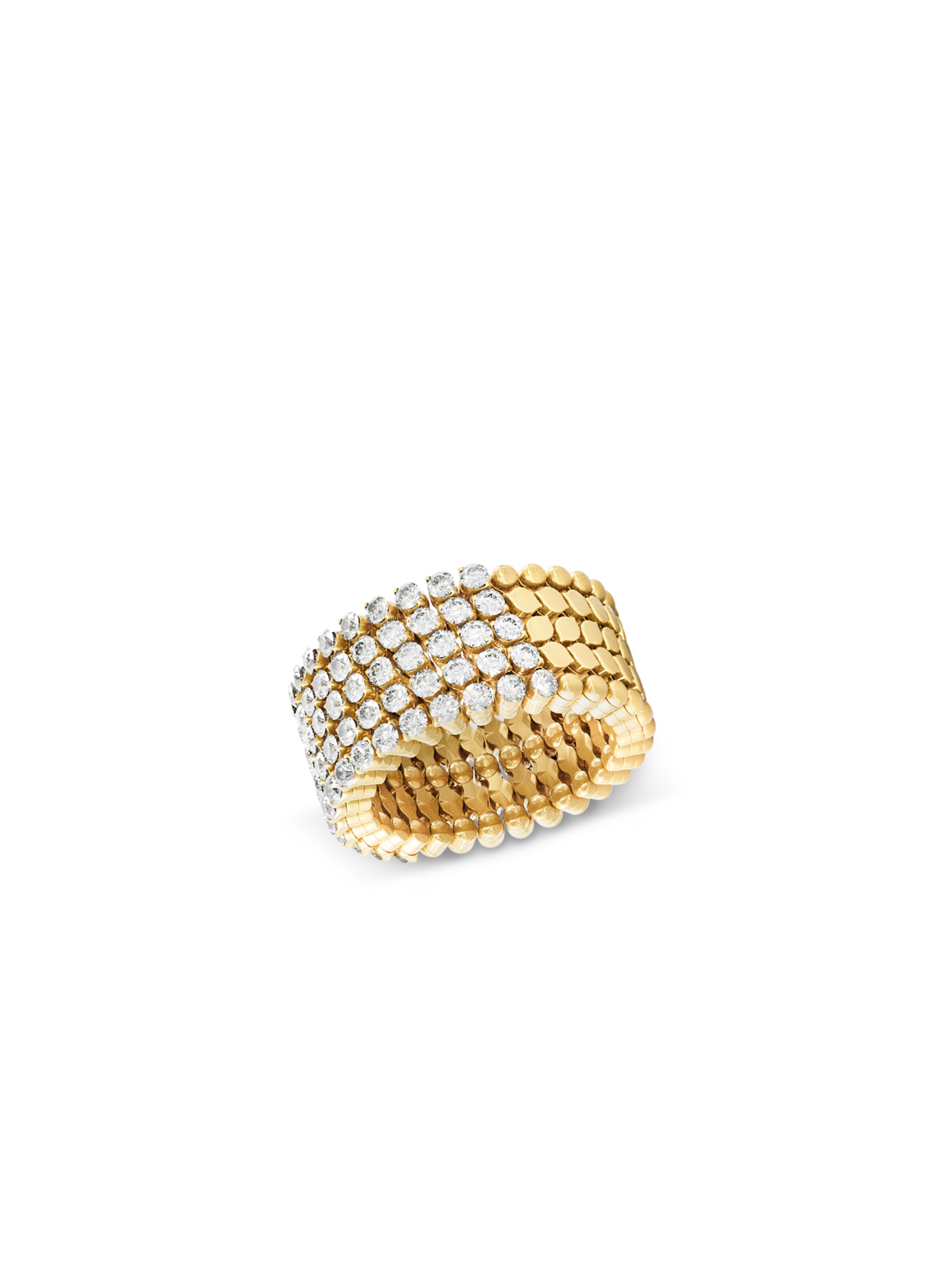 A flexible piece of unisex jewelry with endless appeal! The opulent Multisize Serafino Consoli ring becomes a real quick-change artist thanks to its patented Multisize technology. The innovative creation made of 18k yellow gold can be worn pushed together as a ring or fully pulled apart as a bangle. The five-row design is half-set with 75 brillant-cut diamonds in a prong setting with a total of 1.37 ct and inspires in just about any shape and on any occasion.