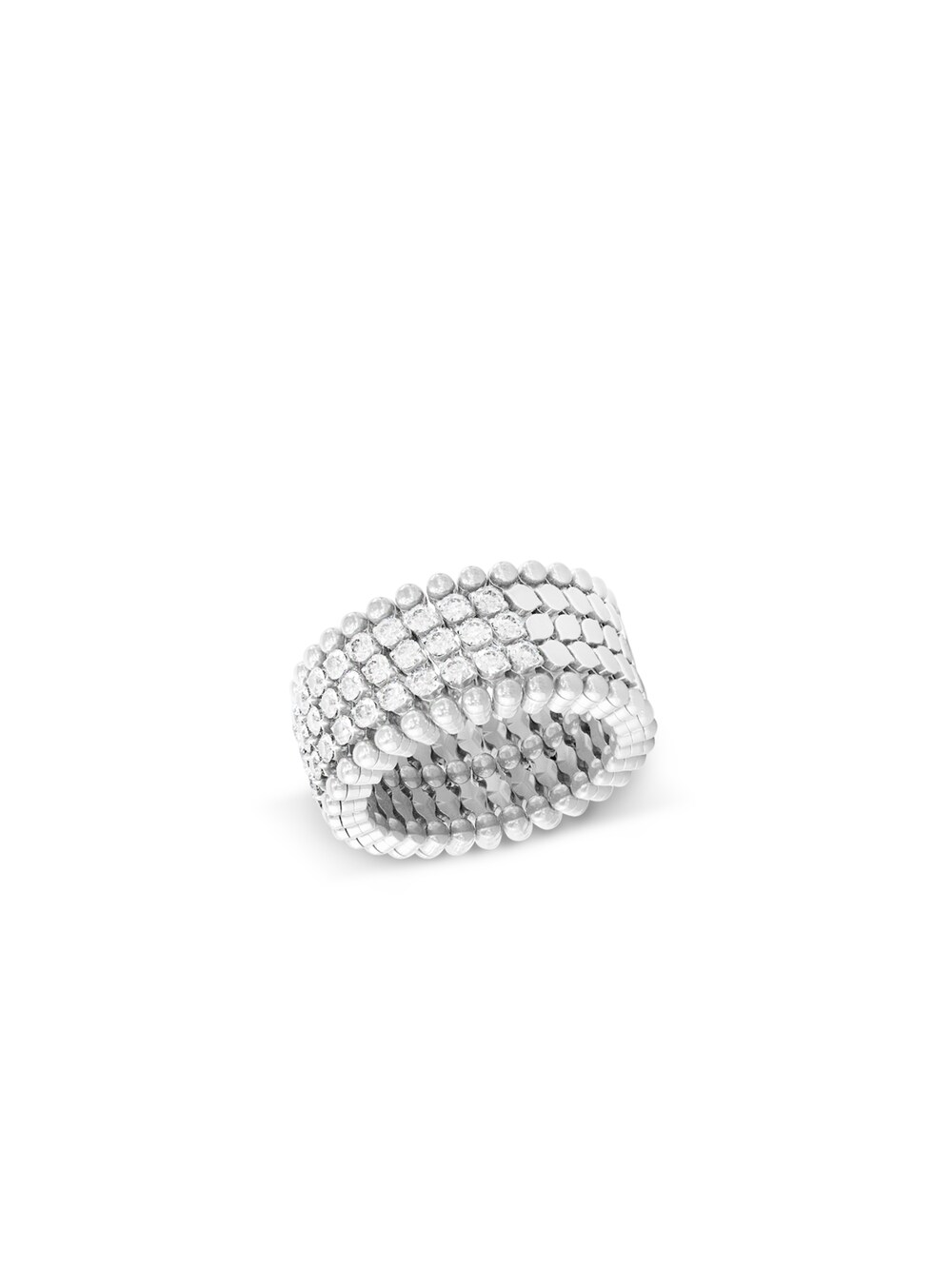 Innovation meets unisex jewelry. The Multisize Serafino Consoli bangle in 18k white gold can be adjusted to the perfect size thanks to its patented Multisize technology, and it also makes a stunning eye-catcher as an opulent ring. The five-row design features three rows that are half-set with 45 brilliant-cut diamonds totaling 0.81 ct in a prong setting and two outer rows of spherical elements. This flexible piece of jewelry also inspires on festive occasions.